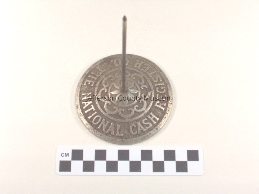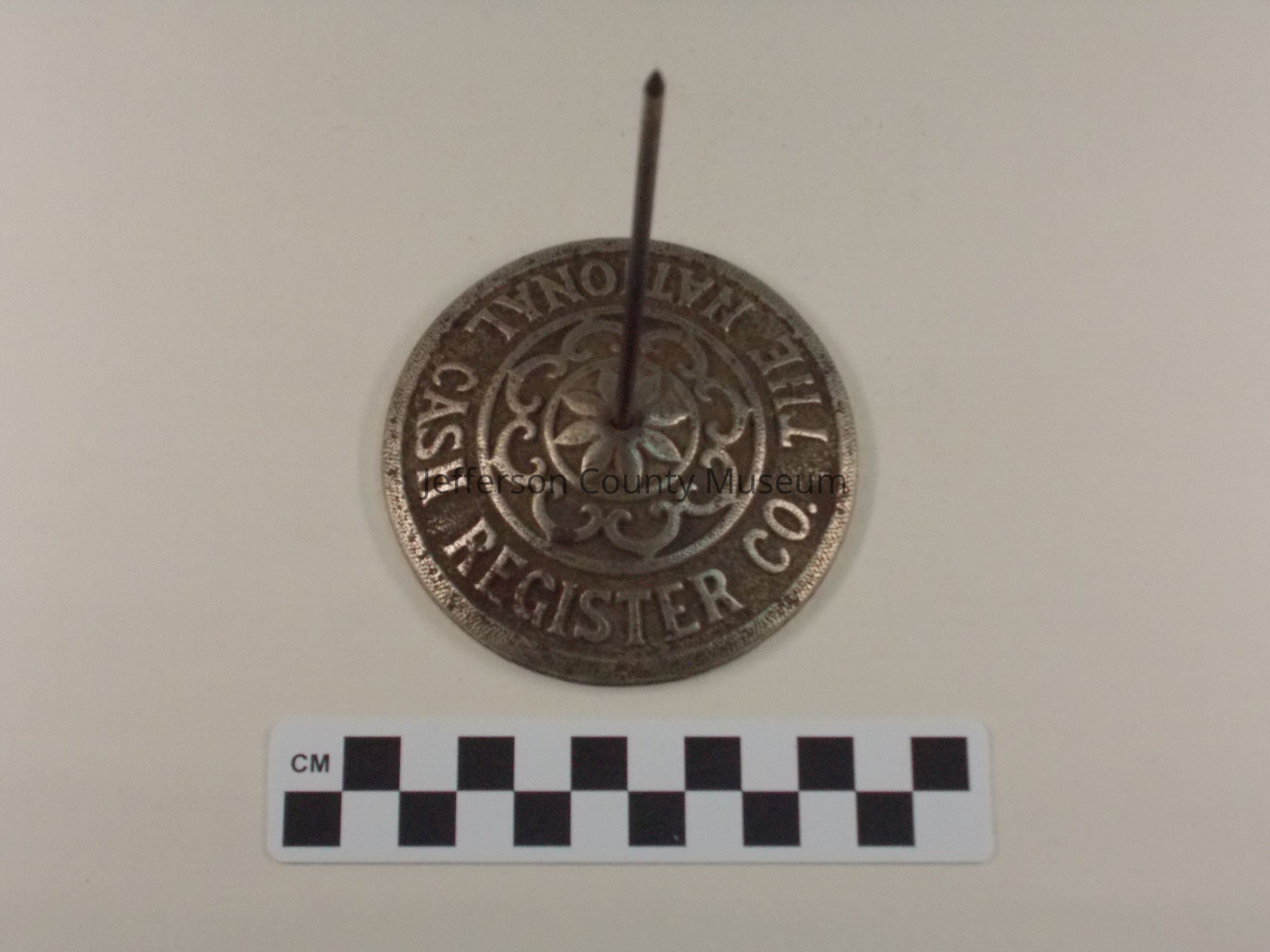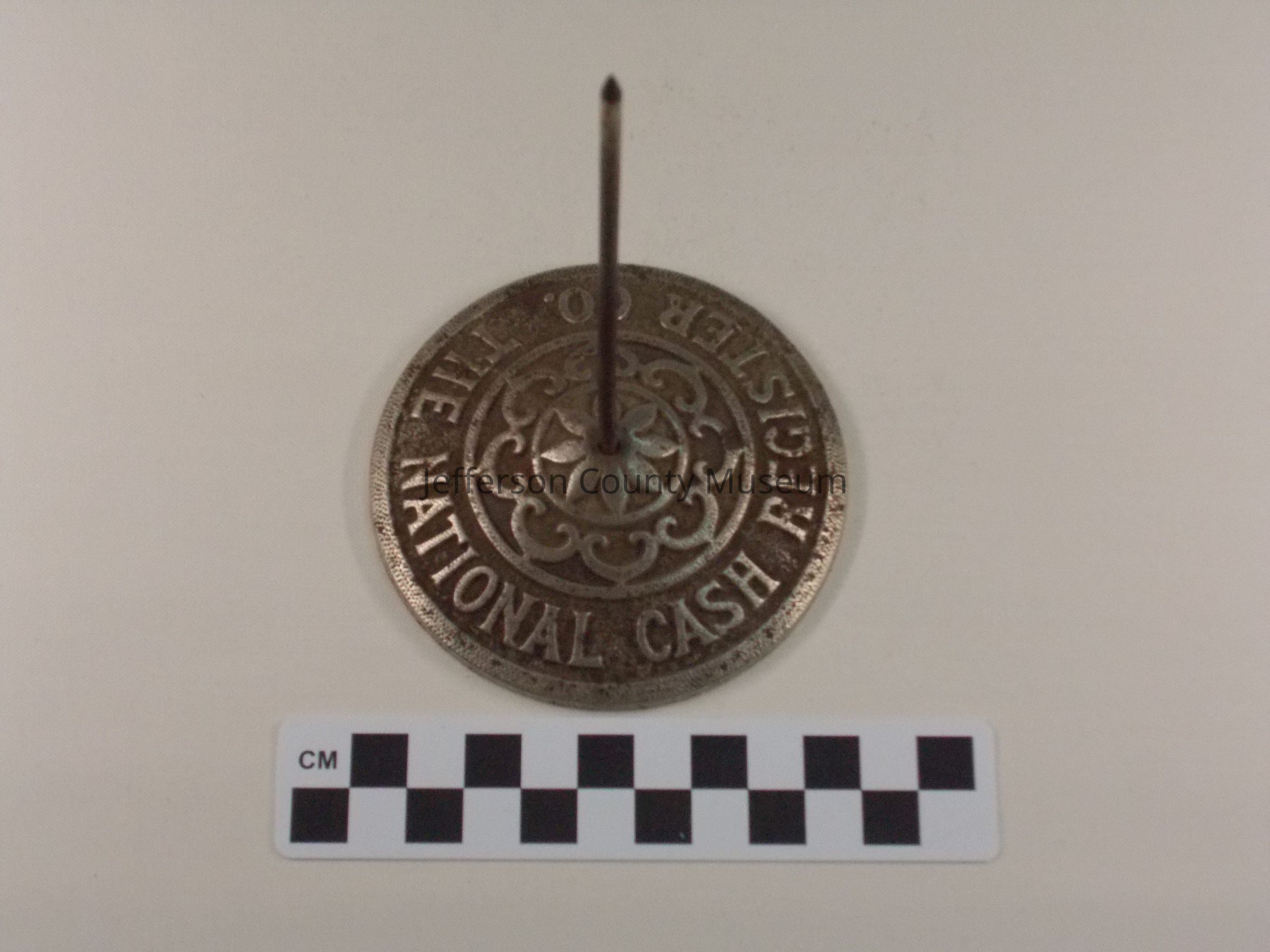 The holder is shaped like a long nail in a round stand. Sales receipts were stuck into the nail. The stand has "THE NATIONAL CASH REGISTER CO." around it. On the underside of the stand is "43 B".Acquisition