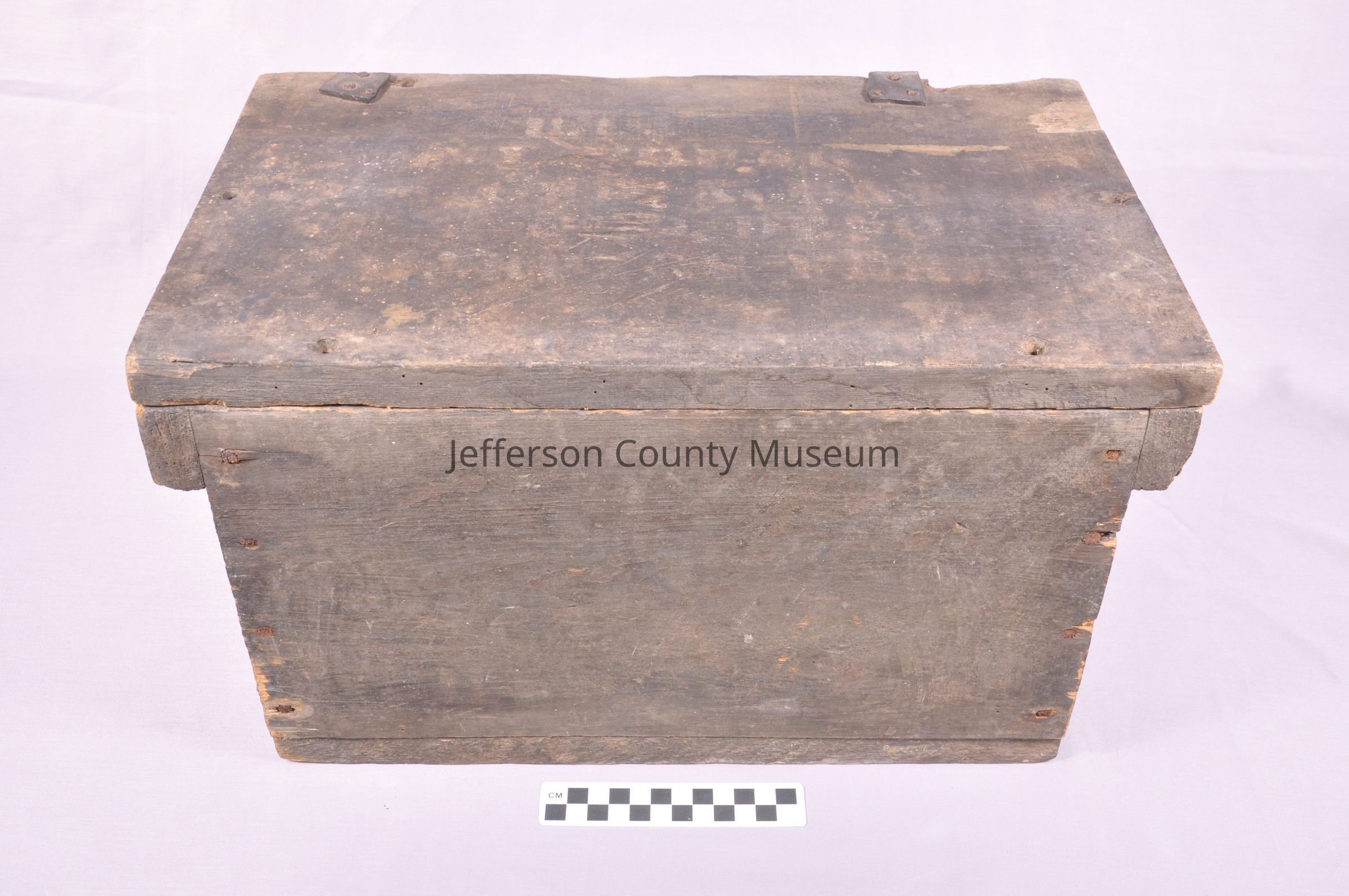 Wooden box. Remnants of two leather hinges. Several words are stencilled on top of box. The only thing mostly legible is "HARPERS FERRY, VA.". On underside of lid stencilled in black is "WATERVLIET ARSENAL MAY 1864". Six nail or screw holes are around the lid and all the way through.Acquisition