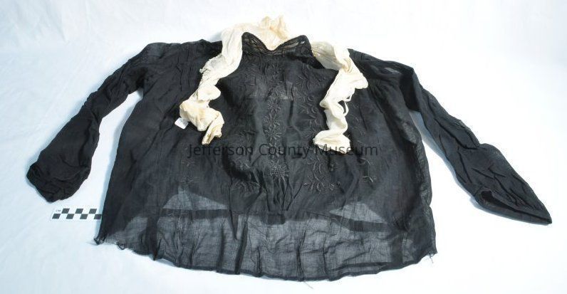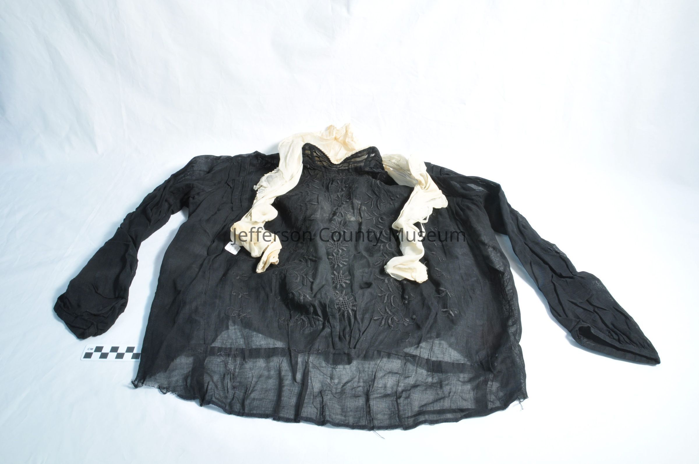 Black cotton blouse with white ribbing around collar. With the blouse is a detached white collar. Blouse has floral design embroidered on front. Small black buttons in back. Collar has long lace piece down front and a small ribbon and buttons and hooks and loops for tying on neck.Acquisition