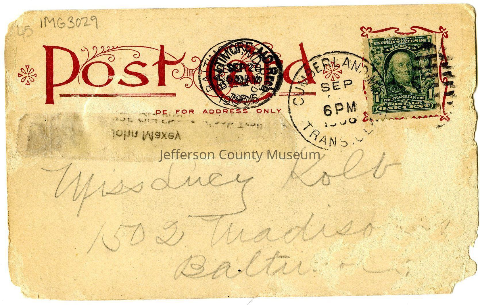 Post-marked September 26, 1906 in Baltimore, MD.
