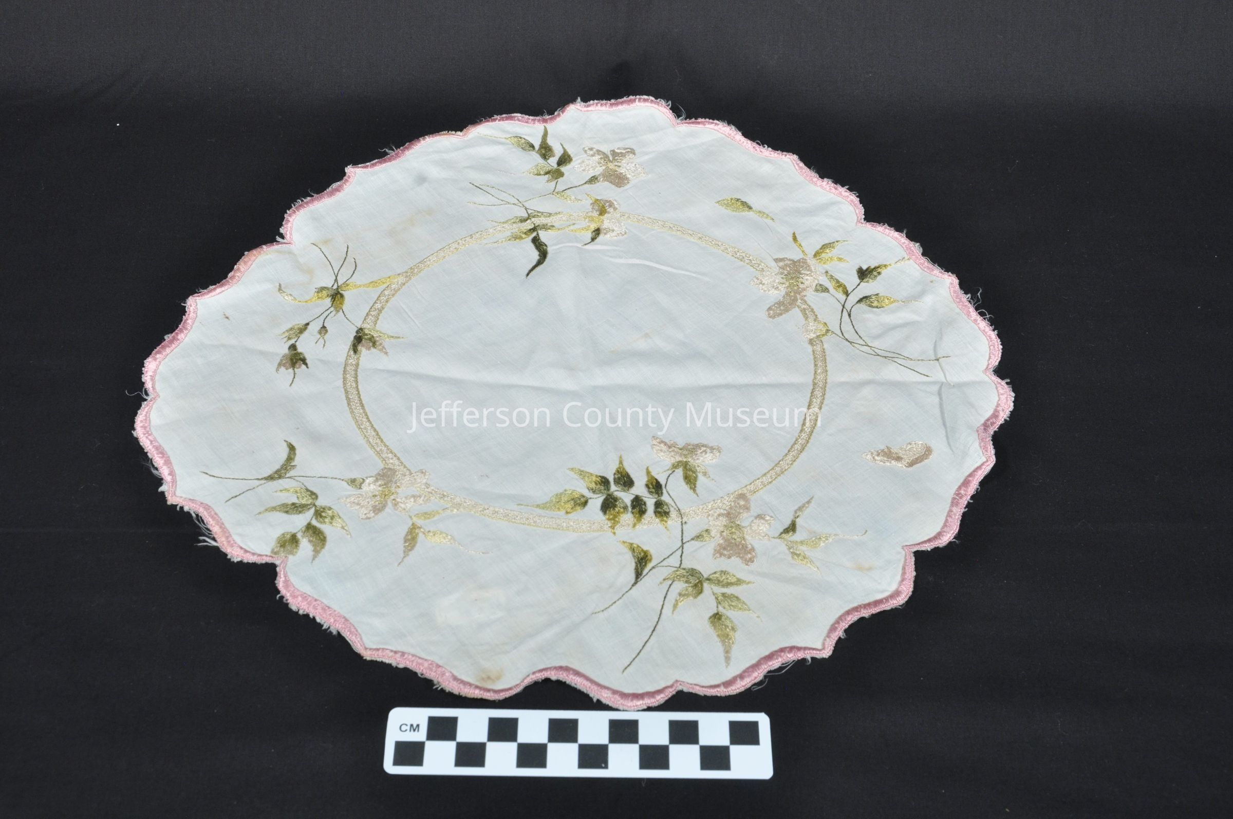 Round, white doily with pink border. Beige and green flowers make up decoration on doily.Acquisition