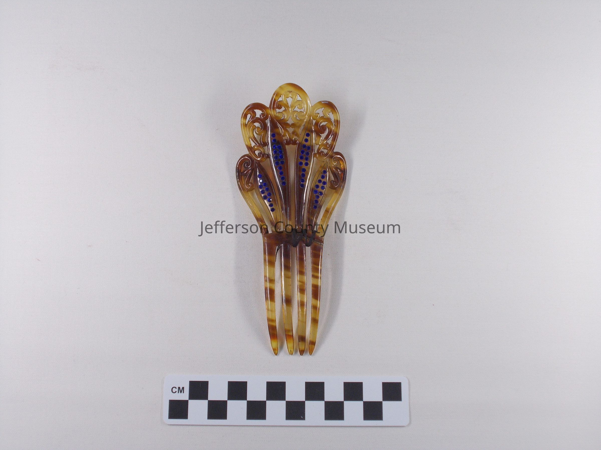 Tortoise shell comb with four teeth. Decorated with blue beads.
