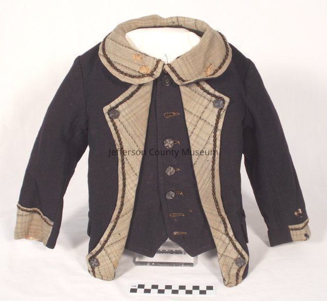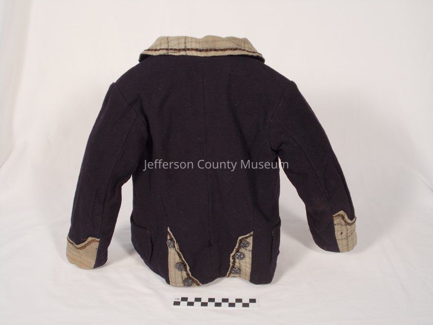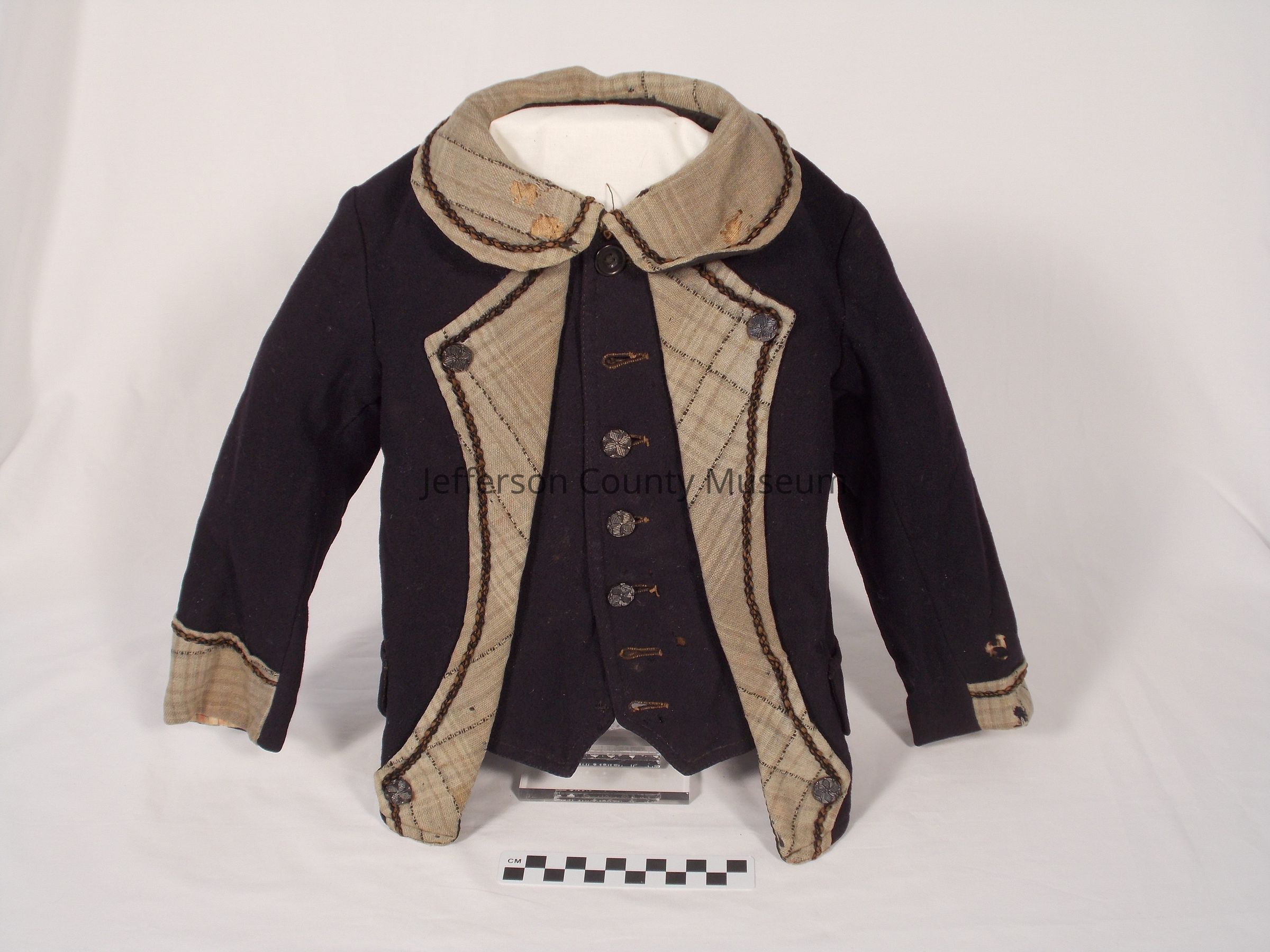 Small boy's jacket. Dark blue wool with gray plaid collar, cuffs and lapels. Four buttons down front, three buttons missing. Four buttons on lapel. Six buttons on back. Two pockets.Acquisition