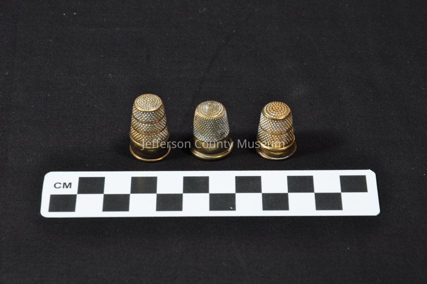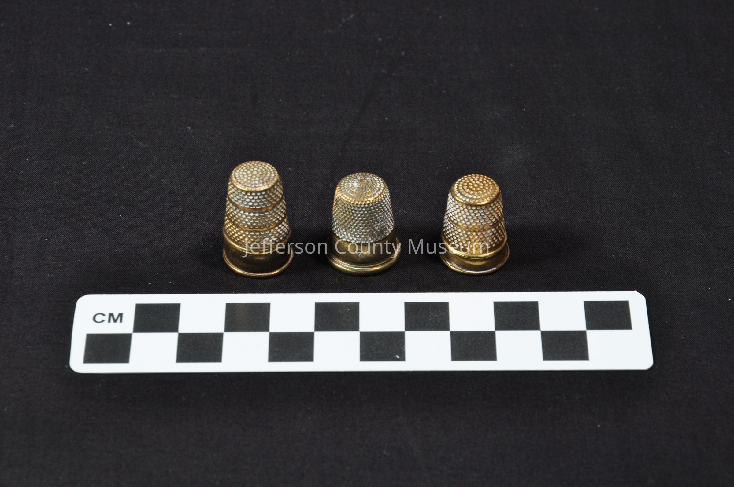 Three brass thimbles. All are different sizes. The tallest one has "MADE IN GERMANY" near bottom. The middle sized one has a "7" near the bottom. The smallest one has no markings.Acquisition