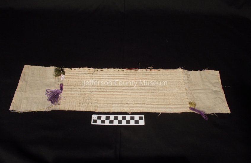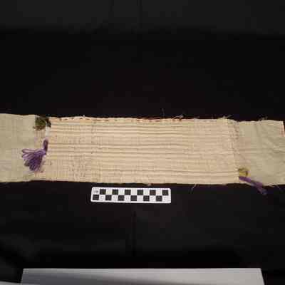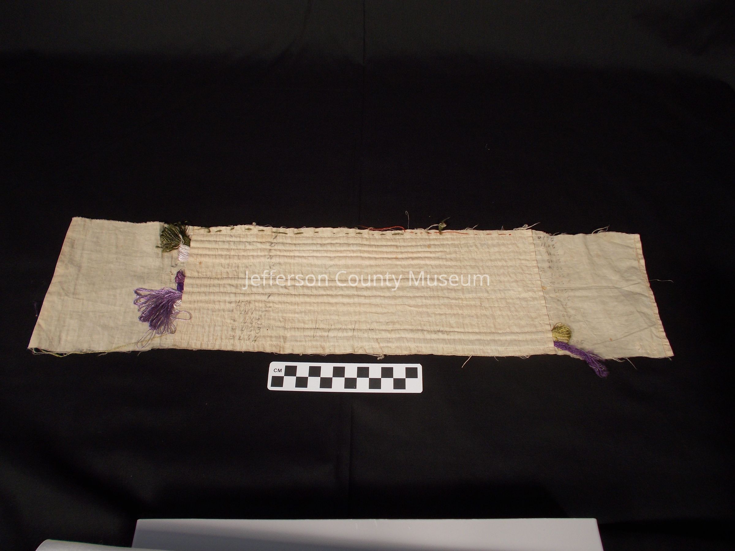 Two pieces of muslin with seamed ribs holding various colored silk thread. The ribs are numbered in pencil. The smaller piece has "VIOLET" written on it.Acquisition