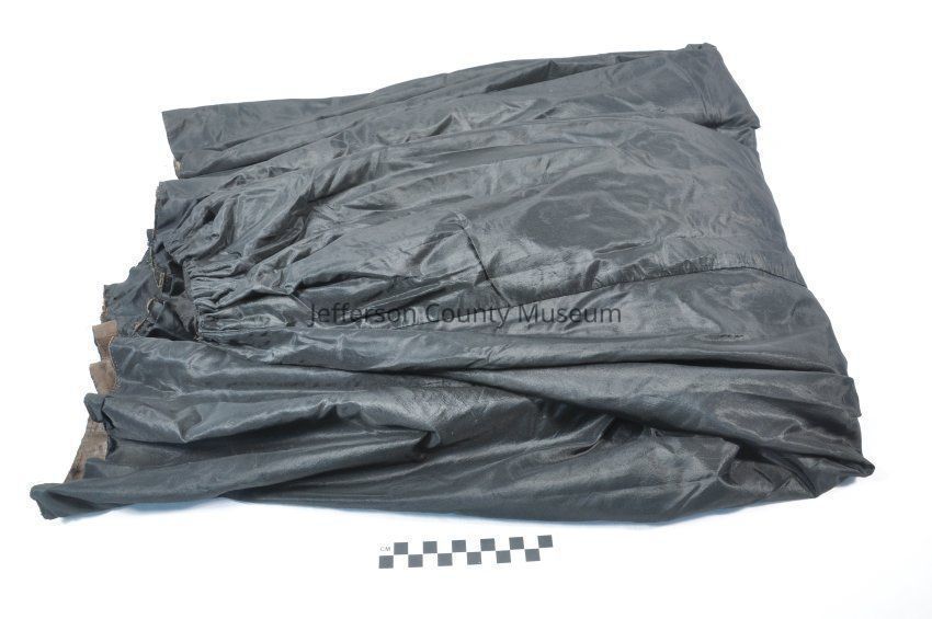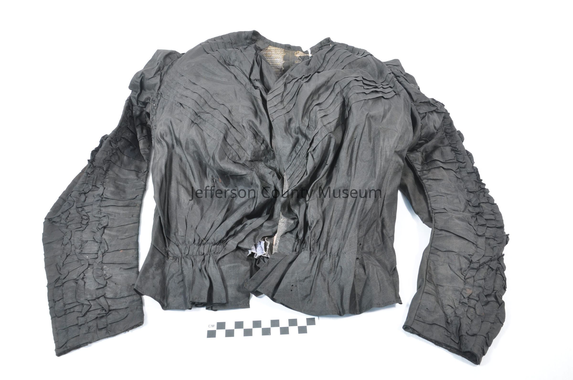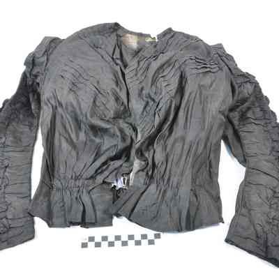 Two piece black silk dress. Bodice (a) is long-sleeved, gathered at waist, has stays inside and has three rows of small ruffles down sleeves. Ribbon sewn to inside with metal hook and loop fastener. Metal hook and loop fasteners down back. Skirt (b) is gathered at waist and has heavy brown lining.Acquisition