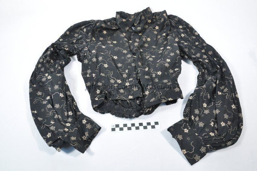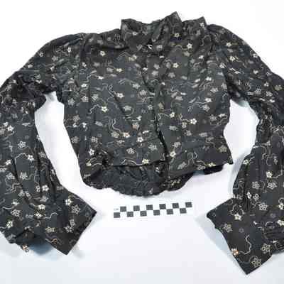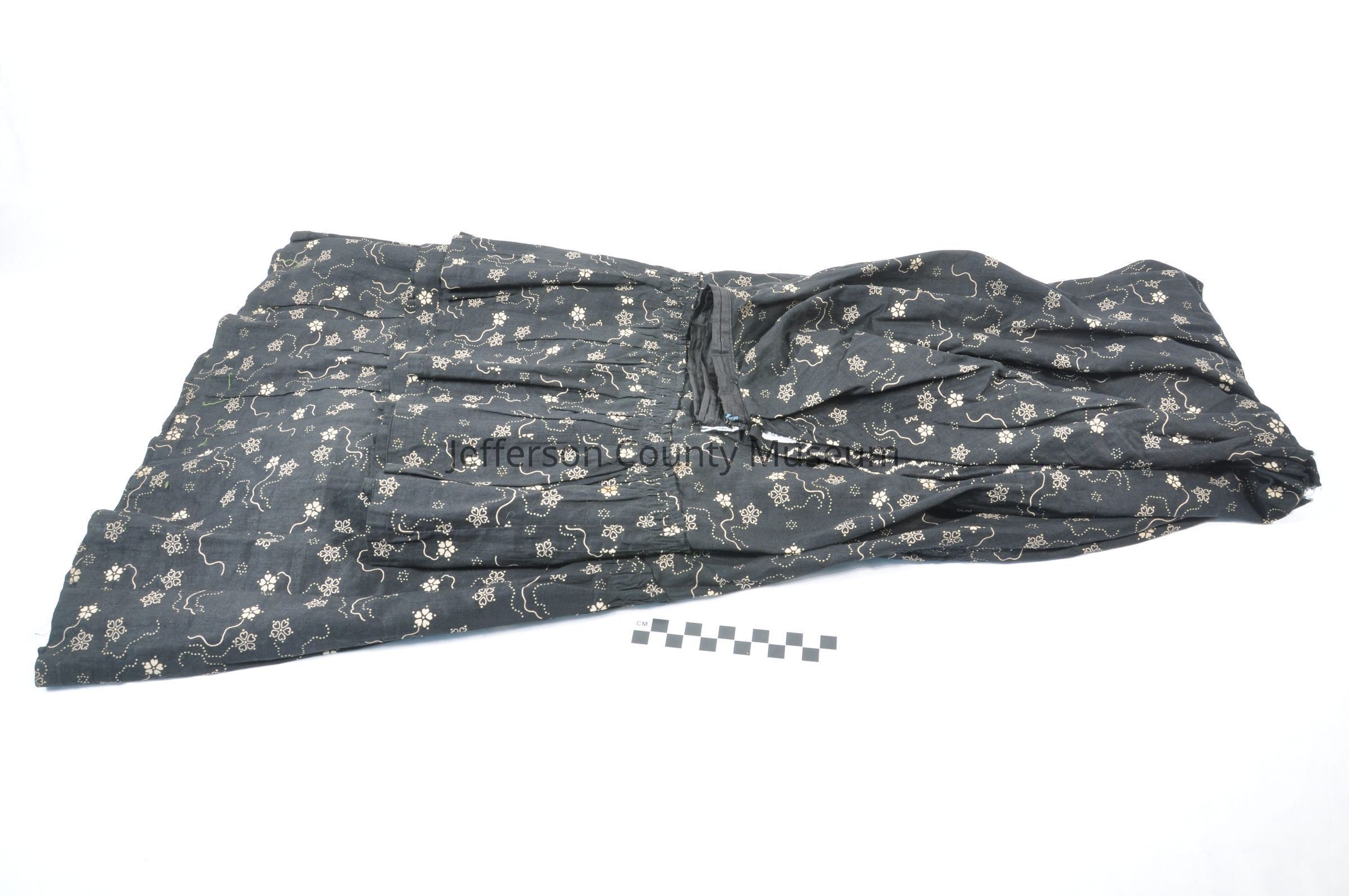Two piece cotton dress. Black with tan flower pattern. Bodice (a) has wide bow in middle and is gathered at bottom. Metal hook and loop closures in back. Skirt (b) has additional piece sewn to bottom and is gathered where it is attached. Back is longer than front.Acquisition