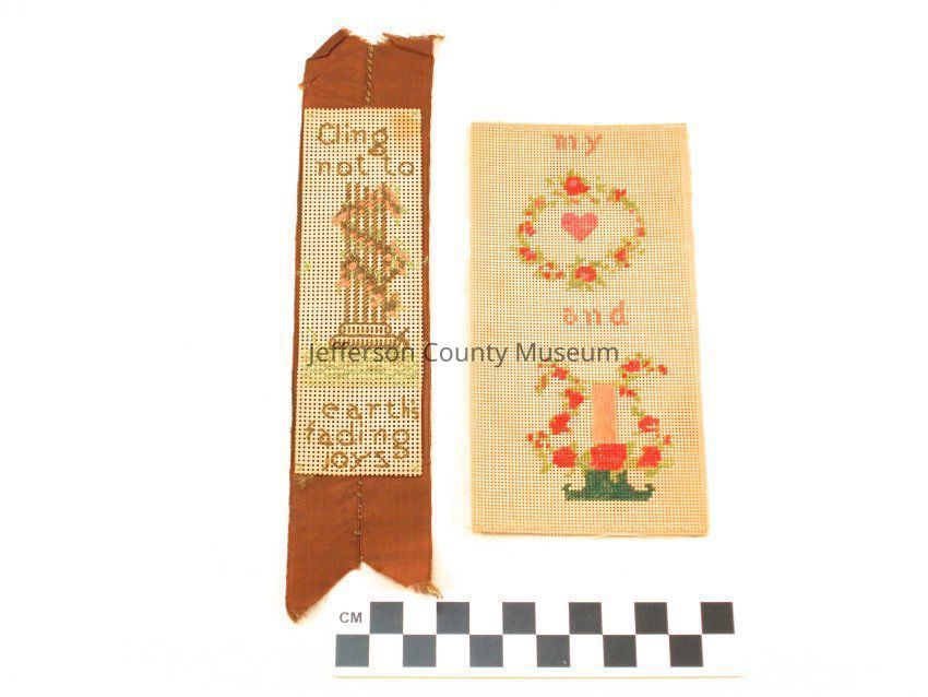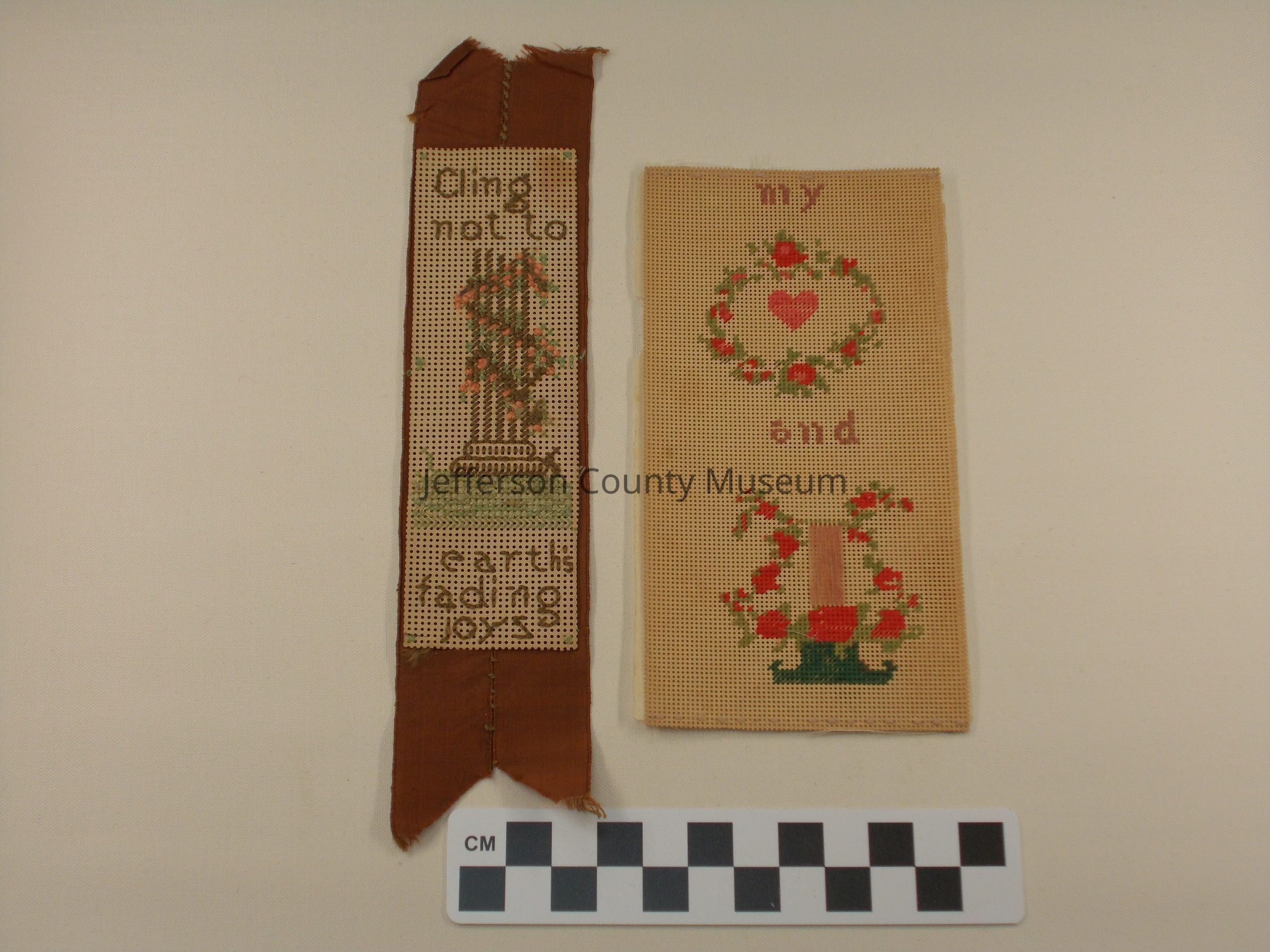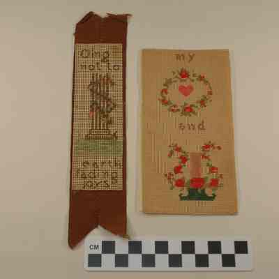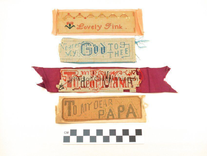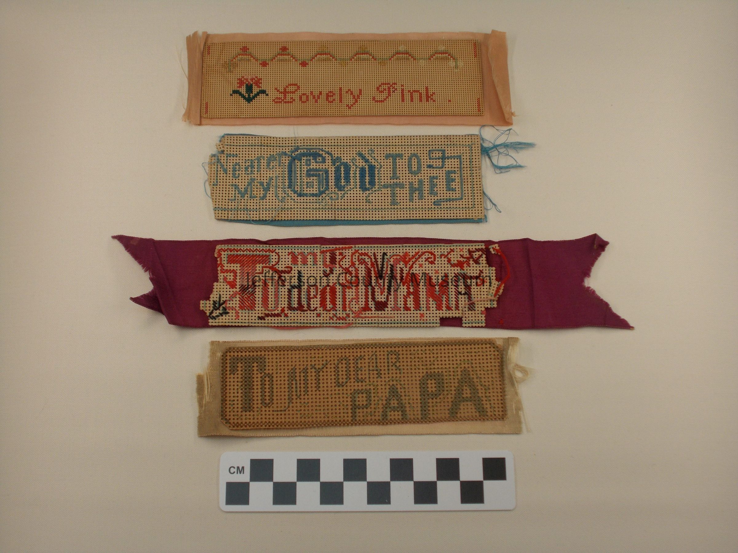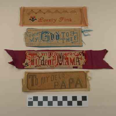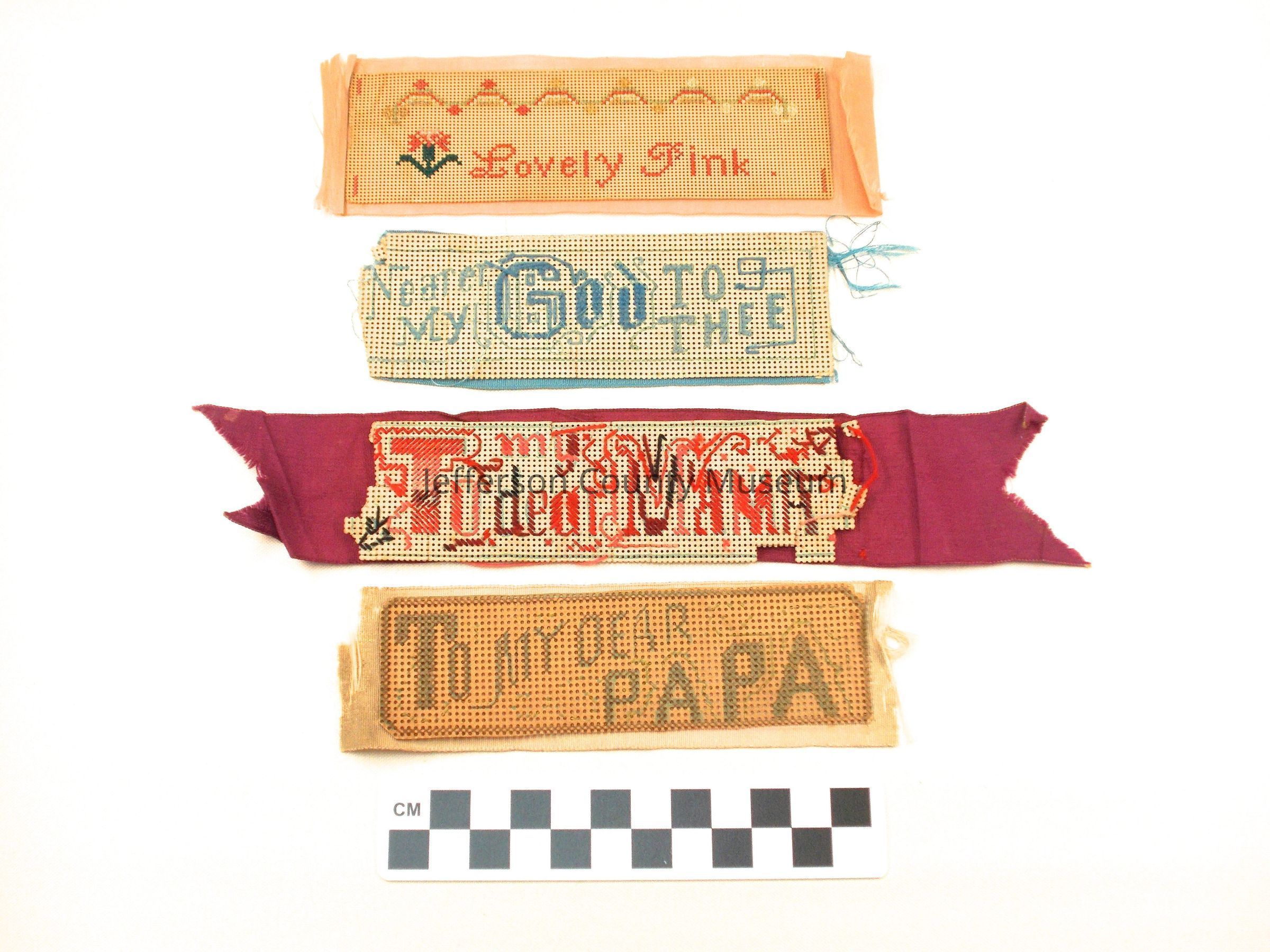 Six handmade paper and silk bookmarks cross stitched into different patterns and sayings. One in green says "TO MY DEAR PAPA". Another says "Lovely Pink" with a pink and green flower beside it and a triangular pattern above. Another in brown says "Cling not to earth's fading joys" with a column with flowers entwining it. The fourth says "my and" with a heart in a wreath of flowers below "my" and a candle with flowers below "and". The fifth on a purple silk ribbon says "To my dear Mama". The sixth is on a light blue ribbon and says "Nearer My God TO THEE".Acquisition