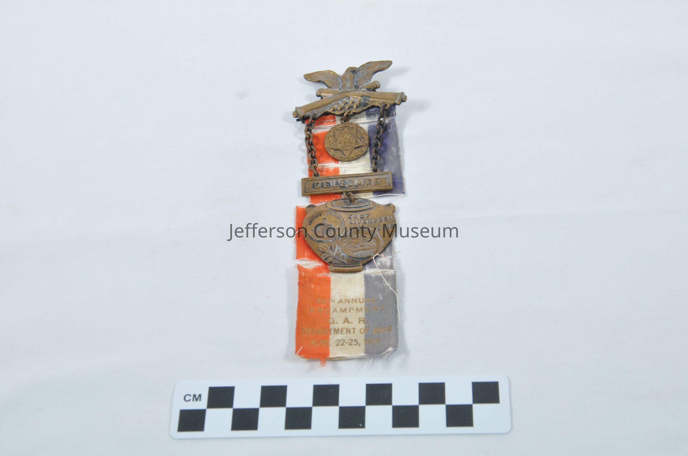 Medal and ribbon commemorating the 48th encampment of the G.A.R. Medal is in four parts. Top has an spread-winged eagle standing on crossed cannons above a pile of cannon balls. Hanging under the eagle is a small rendition of the official medal of the Grand Army of the Republic. Two small chains are attached to the top bar and goes to a bar that says "DELEGATE". The bottom part is in the shape of a jar and has "EAST LIVERPOOL OHIO" with a round image of the "SOLDIERS MEMORIAL CHAPEL" and another round image of "OLDEST POTTERY 1839". On back of the jar is "48TH ANNUAL ENCAMPMENT G.A.R. DEPARTMENT OF OHIO JUNE 22---25, 1914.". A red, white and blue ribbon is attached to the back of the top. The ribbon says in gold letters "48TH ANNUAL ENCAMPMENT G.A.R. DEPARTMENT OF OHIO JUNE 22--25, 1914".Acquisition