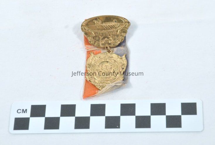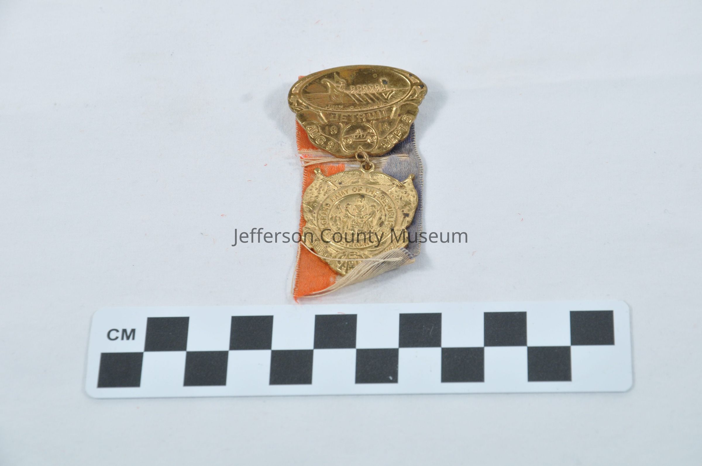 Bright brass colored two-part medal with red, white and blue ribbon attached. Top part of medal has a boat with rowers and a man at each end. Date below boat is "JULY 24, 1701". Below that is 'DETROIT 1914 AUG.31 SEPT, 5. Between the dates in a circle is an automobile. The medal hanging below that has a spread-winged eagle with flags on each side. In the center circle is "GRAND ARMY OF THE REPUBLIC VETERAN 1861 1866". Below that is 48TH NATIONAL ENCAMPMENT GAR".Acquisition