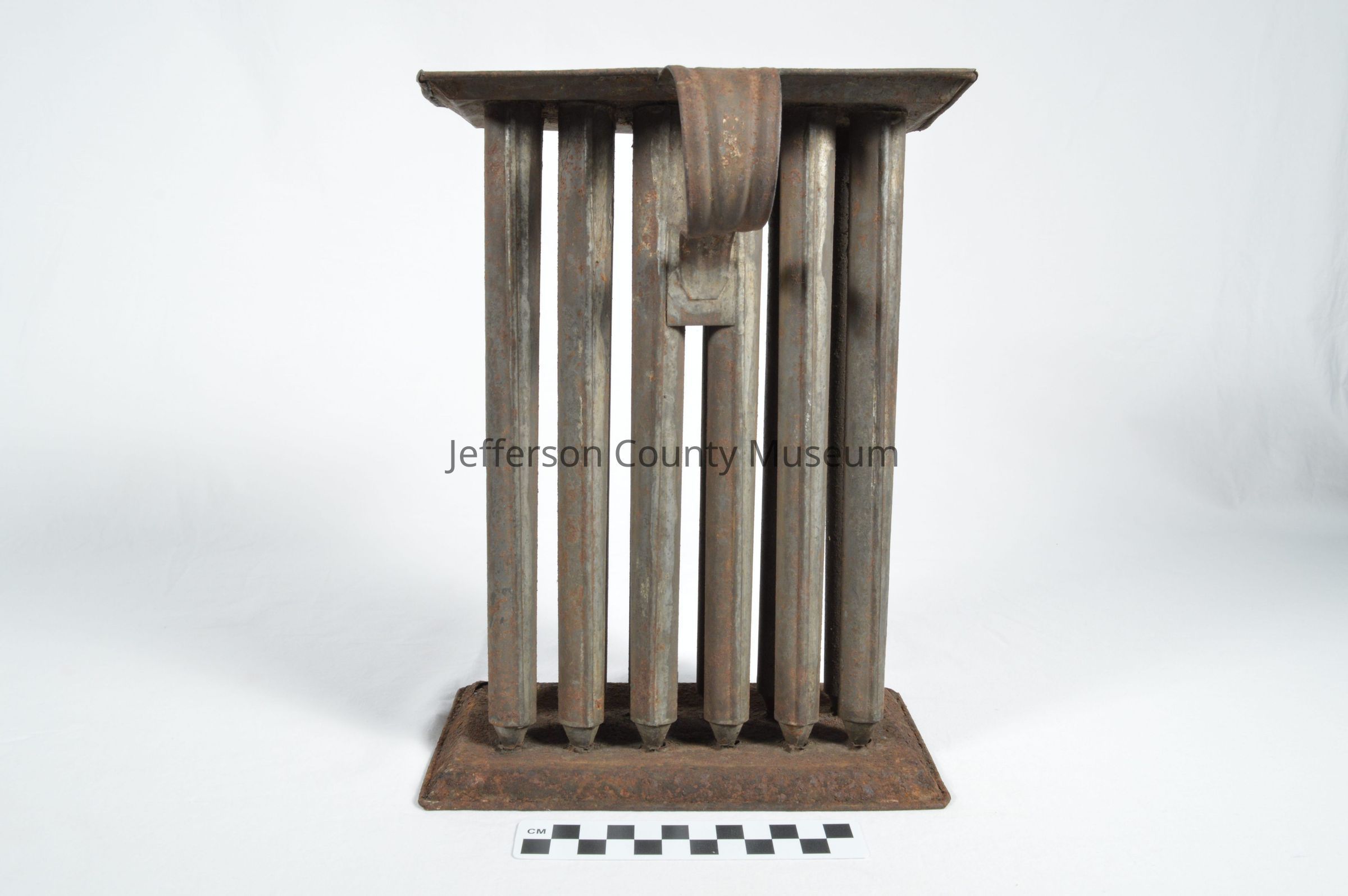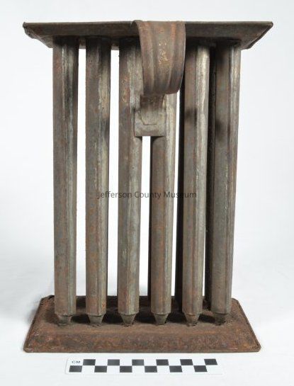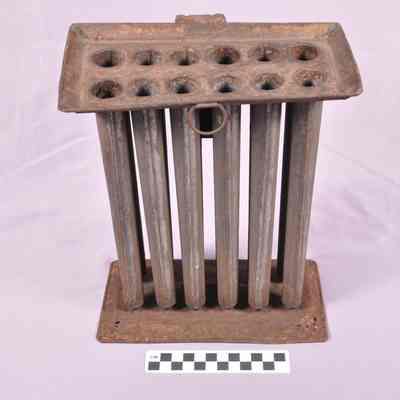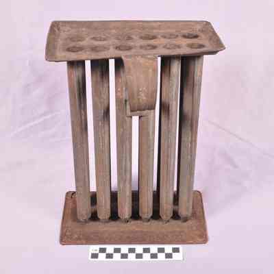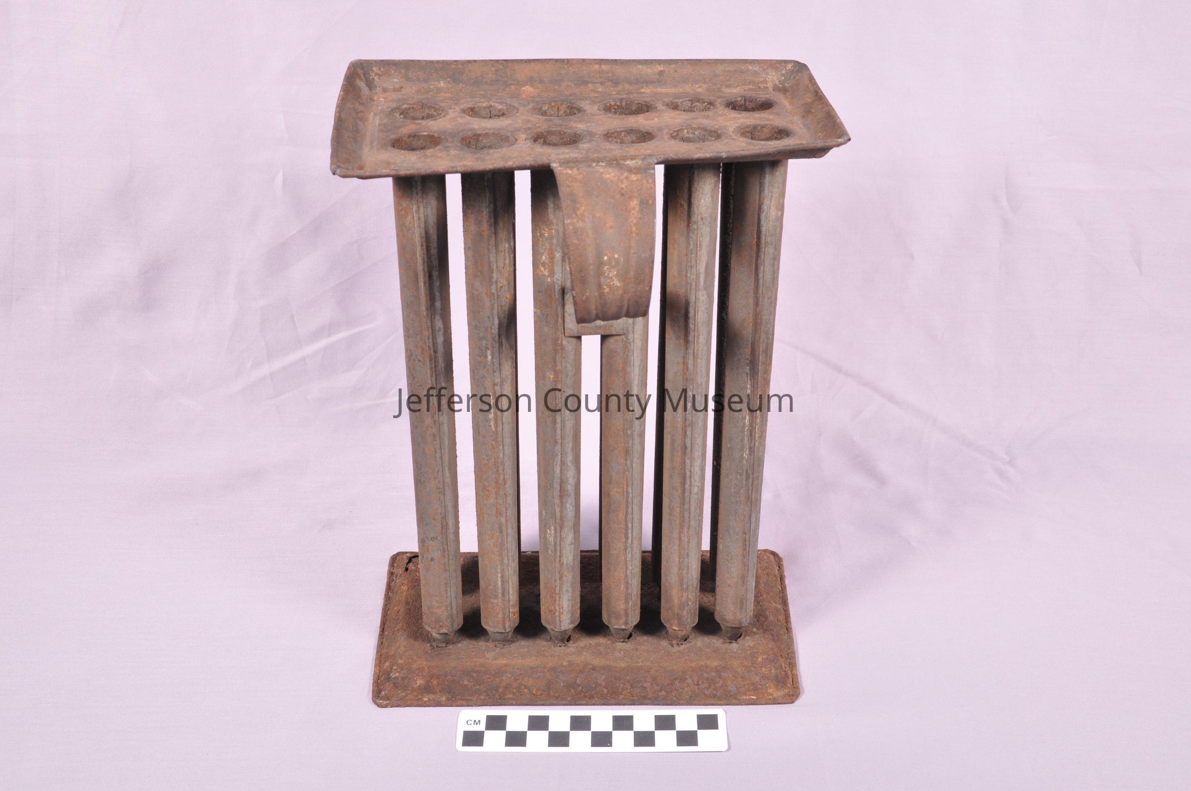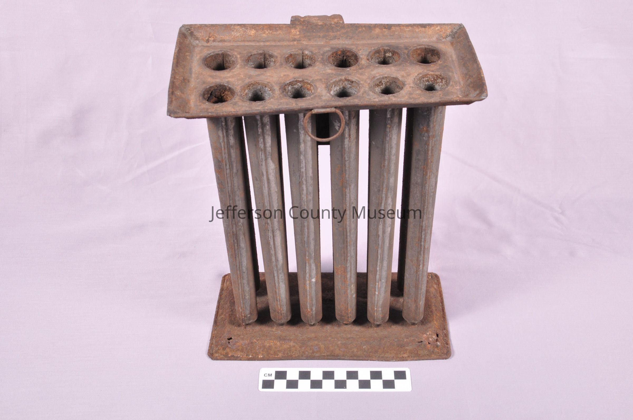 Tin candle mold with twelve holes, six on each side. Large handle. Rectangular base. Mold was made to sit slightly off center. Ring on opposite side of handle for hanging.Acquisition