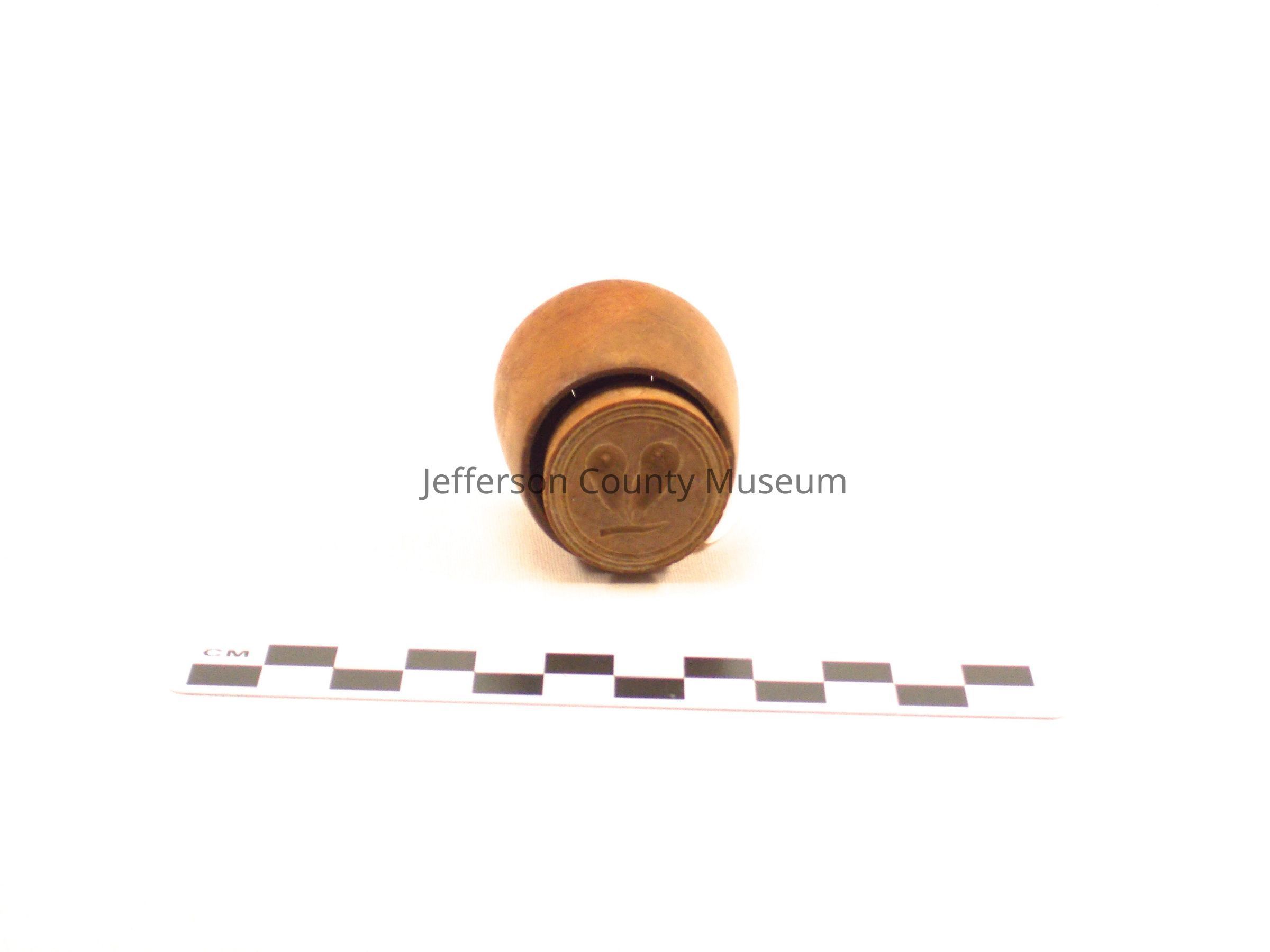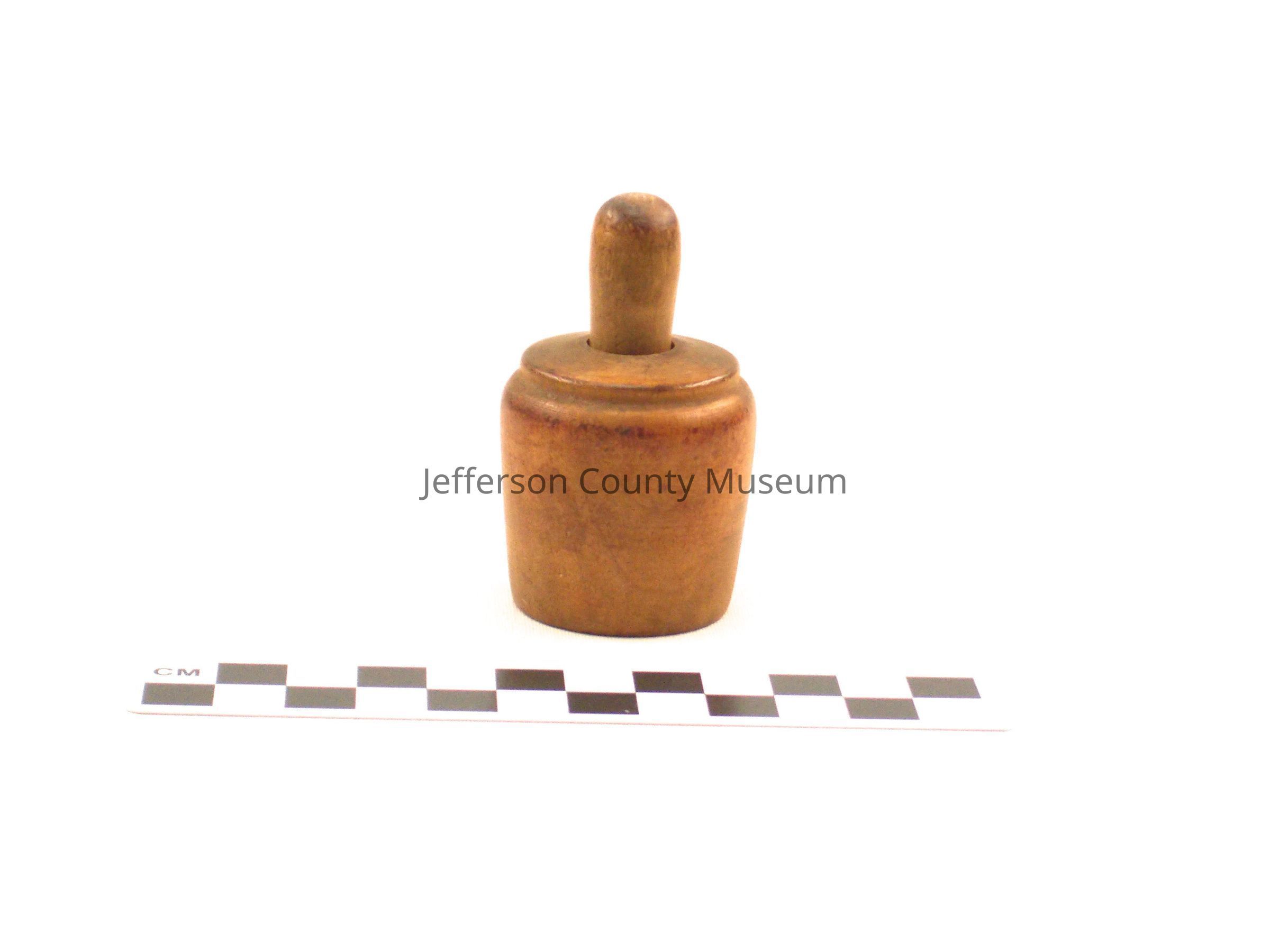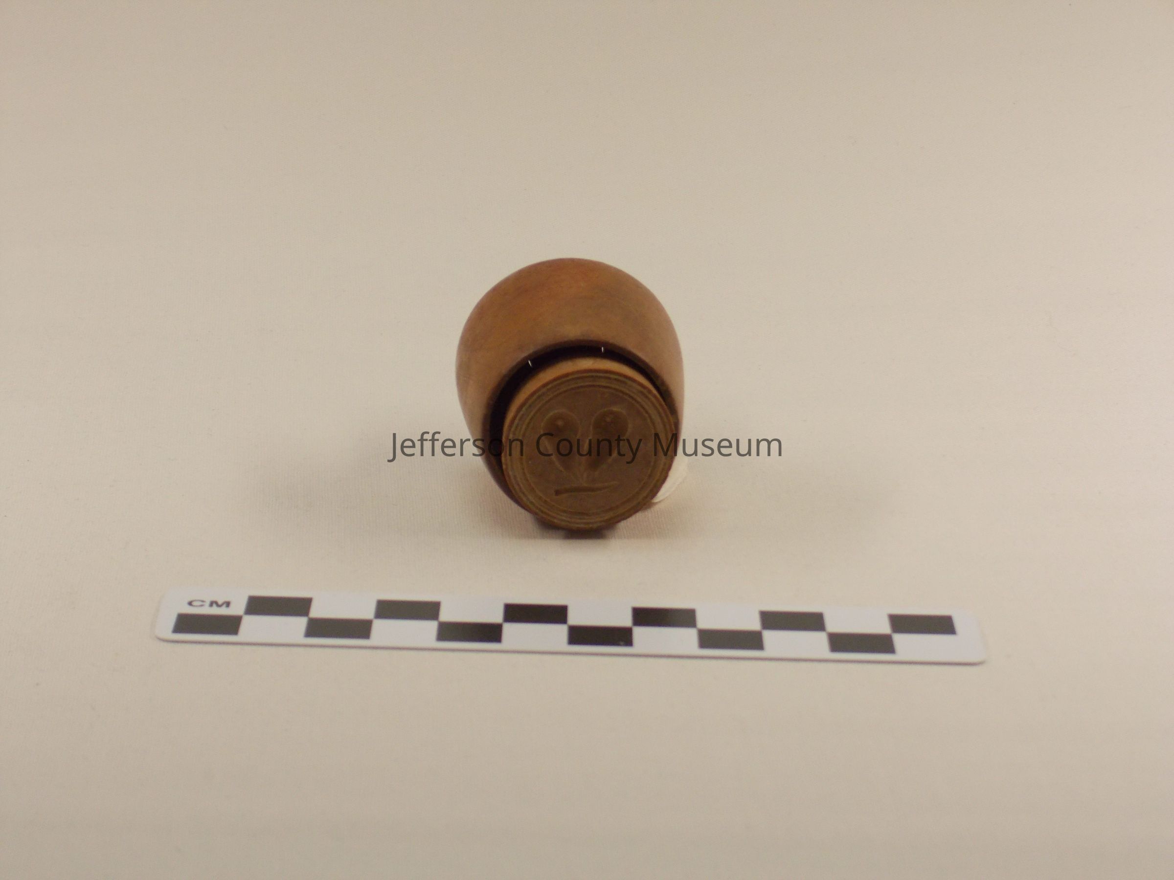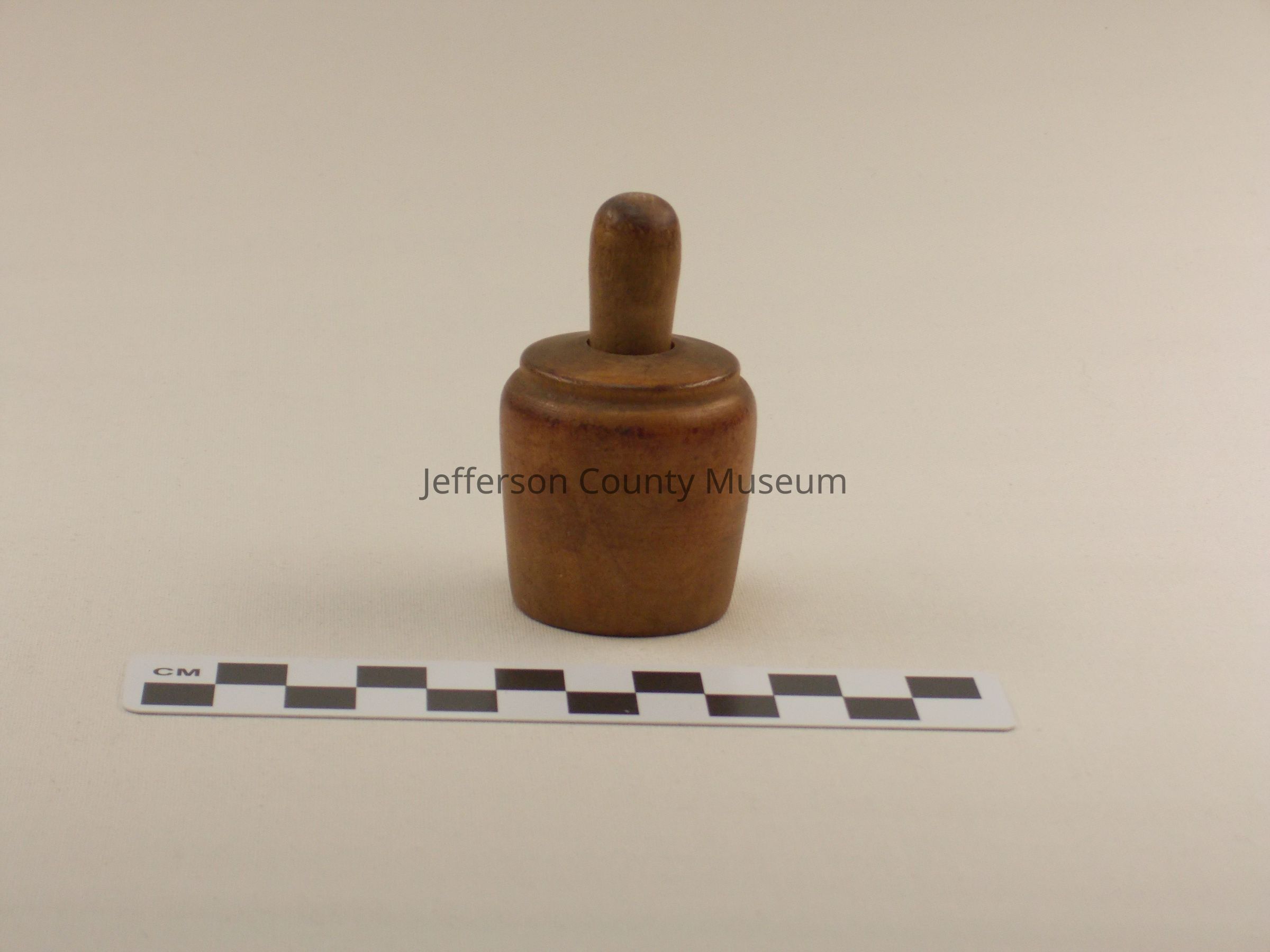 Small, round wooden, tapered mold. The handle is made so that it cannot be removed from the mold. Mold is for imprinting a design in the butter possibly of a flower or leaves.Acquisition