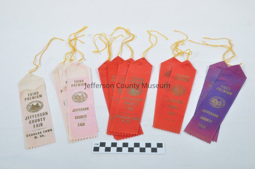 Blue, red and white ribbons from the Jefferson County Fair for the years 1958 and 1960 awarded to Frances Barfield. There are two blue, seven red and four white ribbons. The blue ribbons say "FIRST PREMIUM JEFFERSON COUNTY FAIR" The red ribbons say 'SECOND PREMIUM JEFFERSON COUNTY FAIR" and the white ribbons say "THIRD PREMIUM JEFFERSON COUNTY FAIR". Each has the seal of the state of West Virginia in the center and a yellow string attached.Acquisition