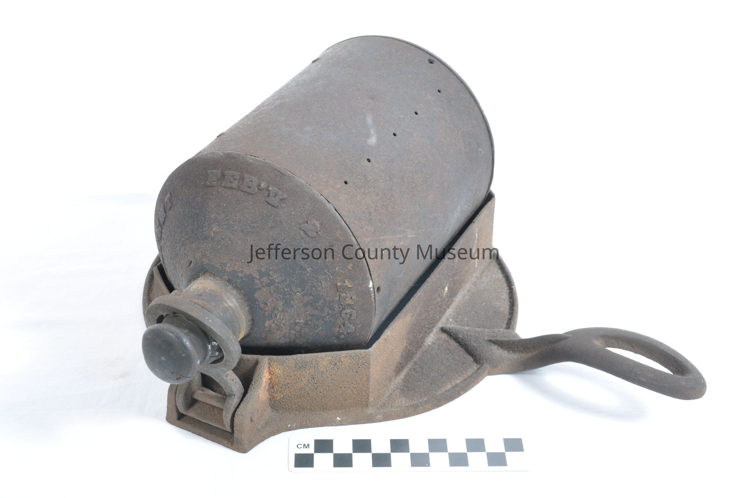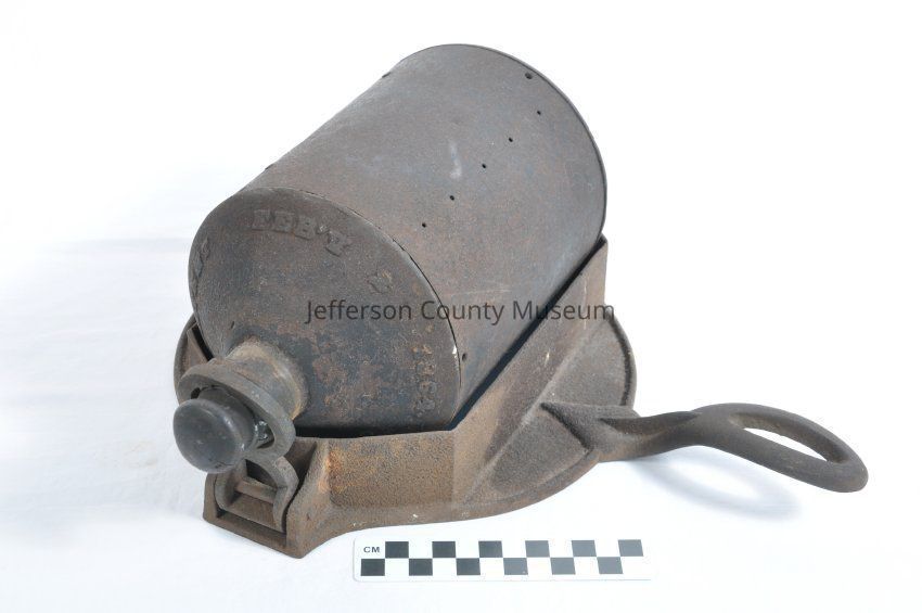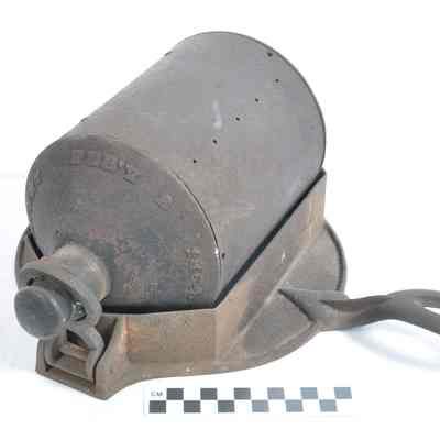 Two piece roaster for roasting coffee beans on a wood stove. Bottom part is cast iron and pan-like with a handle on one side. There is a 4.5 cm. lip in which the cylindrical roaster sits. There is a small handle on one side of the cylinder to crank it as it sits on the stove. In the other end is a wood stopper with a scoop attached for testing the coffee. There are small holes in the cylinder. The plugged end of the cylinder rests in a ring that can be raised and lowered. On the plugged end of the cylinder is "E.J. HYDE'S PATENT FEB'Y 2, 1864."Acquisition