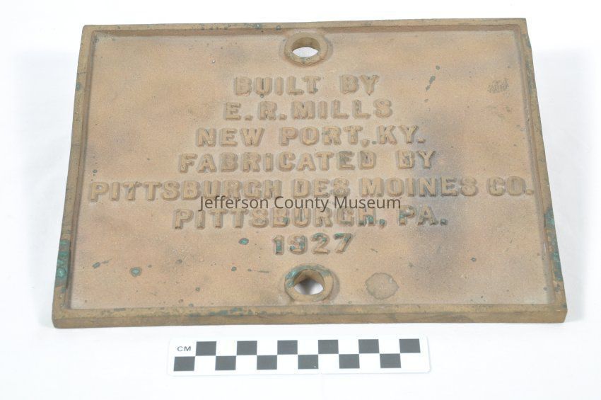 Bronze plaque from Dailey Bridge on the Shenandoah River at the Bloomery in Jefferson County inscribed "BUILT BY E. R. MILLS NEW PORT, KY. FABRICATED BY PITTSBURGH DES MOINES CO. PITTSBURGH, PA. 1927". Hole at top and bottom for affixing to bridge.Acquisition