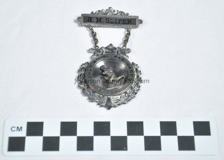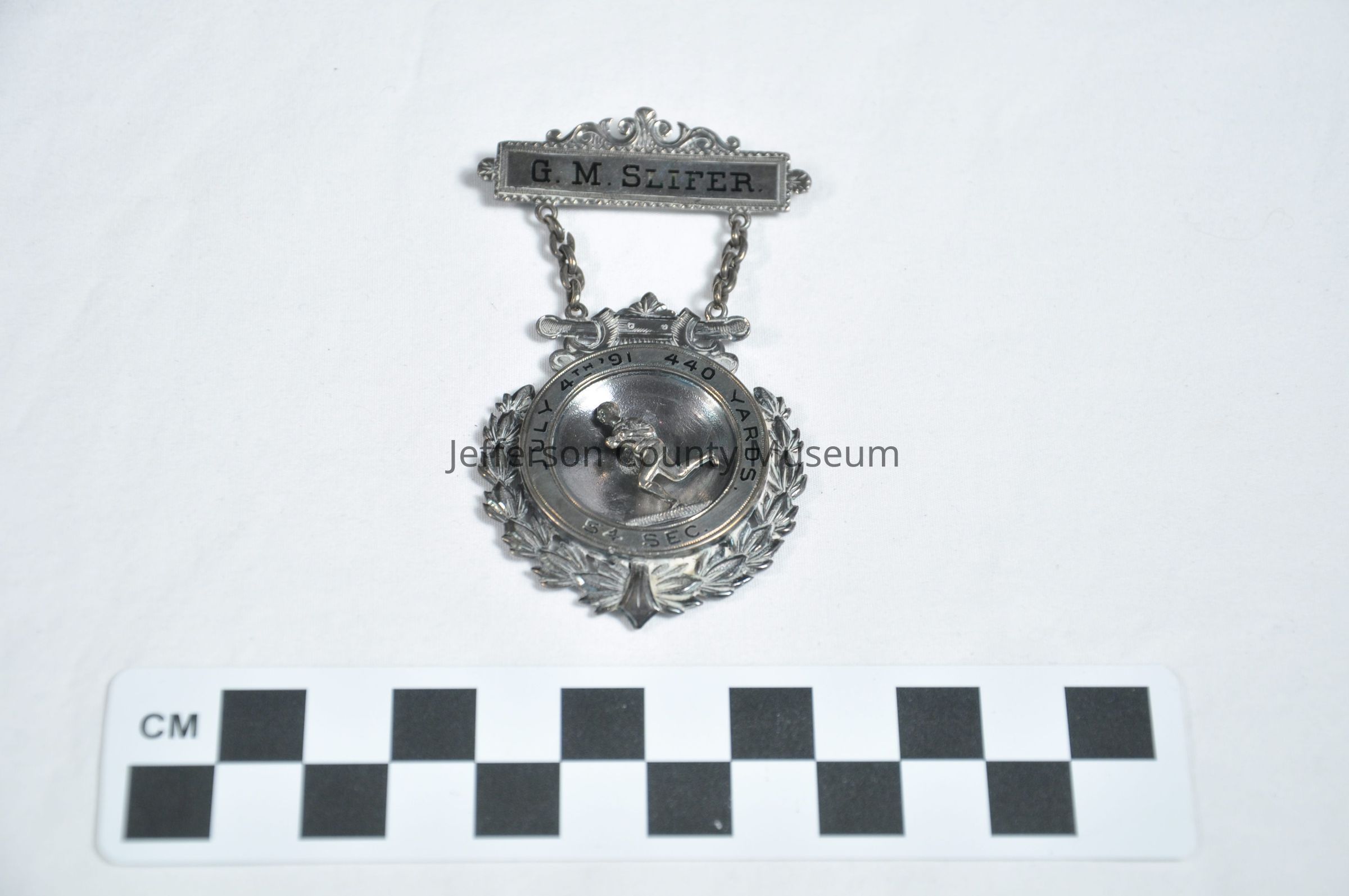 Silver medal with bar at top with "G. M. SLIFER." on it. Hanging from bar on small chain is a round medal with a runner in the center. The runner is attached with a pin that rotates. Around the runner are the words "JULY 4TH '91 440 YARDS 54 SEC.". A wreath surrounds the medal. On back of medal is BRAXMAR N.Y.".Acquisition