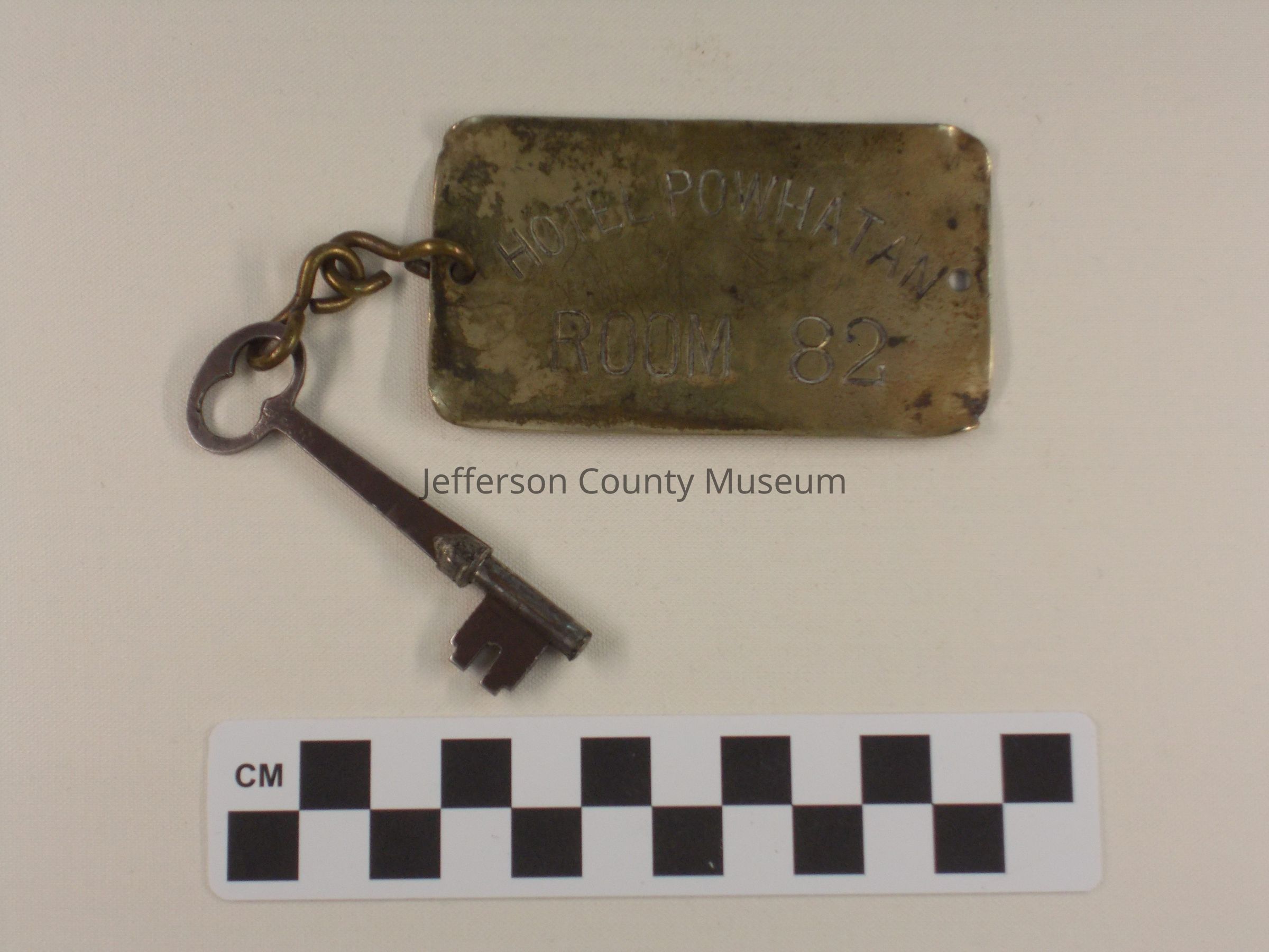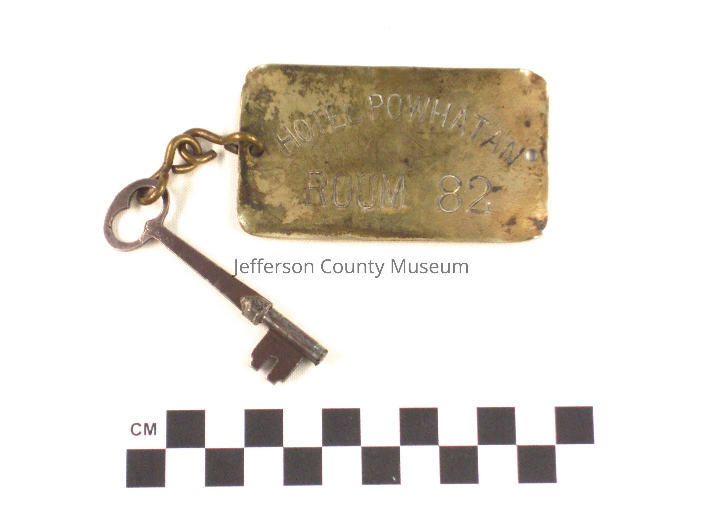Door key on heavy brass two-link chain attached to a brass plate. Brass plate says "HOTEL POWHATAN ROOM 82". One side of key has the number "6" and "SARGENT & CO". The other side of key has "PAT. DEC 16 84".