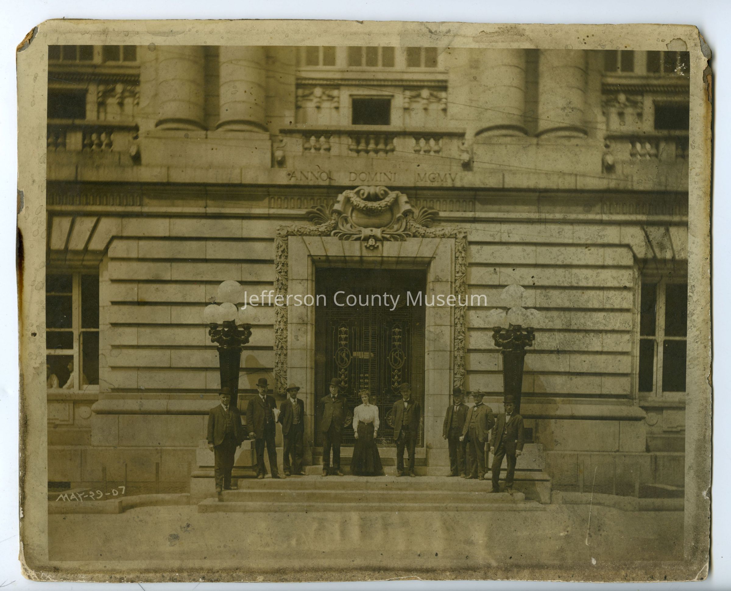 Black and white photograph of a group of individuals standing in front of a building with an elaborate doorway and balcony above with the inscription "ANNO DOMINI MCMV". The man standing at far right is J.C. Holmes, a Jefferson County resident who, according to historian Doug Perks, worked for the US Treasury. This is not the treasury building, but could possibly be an office building in DC. Photo date is in bottom left corner.Photograph Details