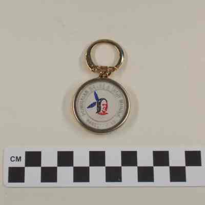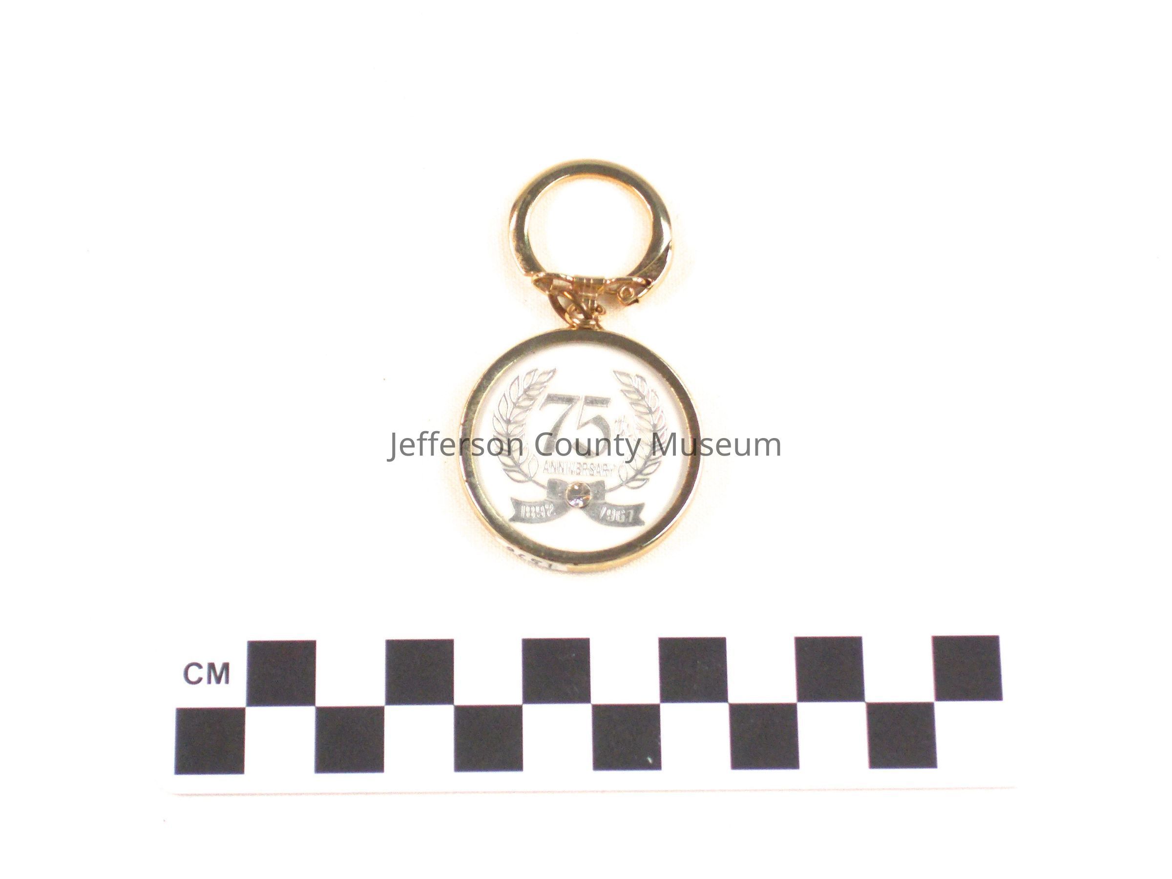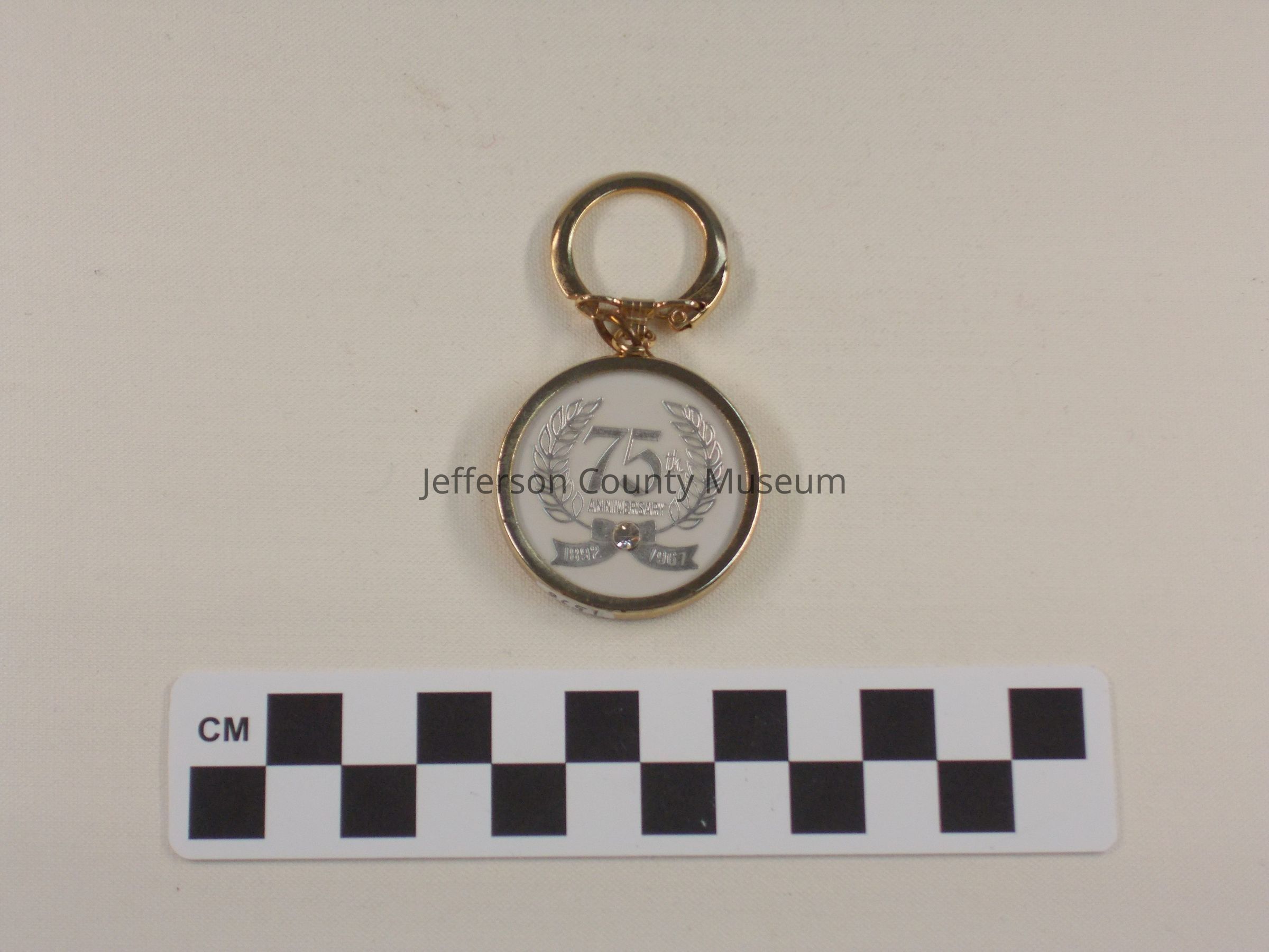 Round medallion on key chain. White background with "POWHATAN BRASS & IRON WORKS, RANSON, W.VA. Red, black and blue head of an Indian in center. On reverse is "75th ANNIVERSARY" with a silver wreath on sides. Below is a silver ribbon with a rhinestone and the dates "1892 1967".Acquisition