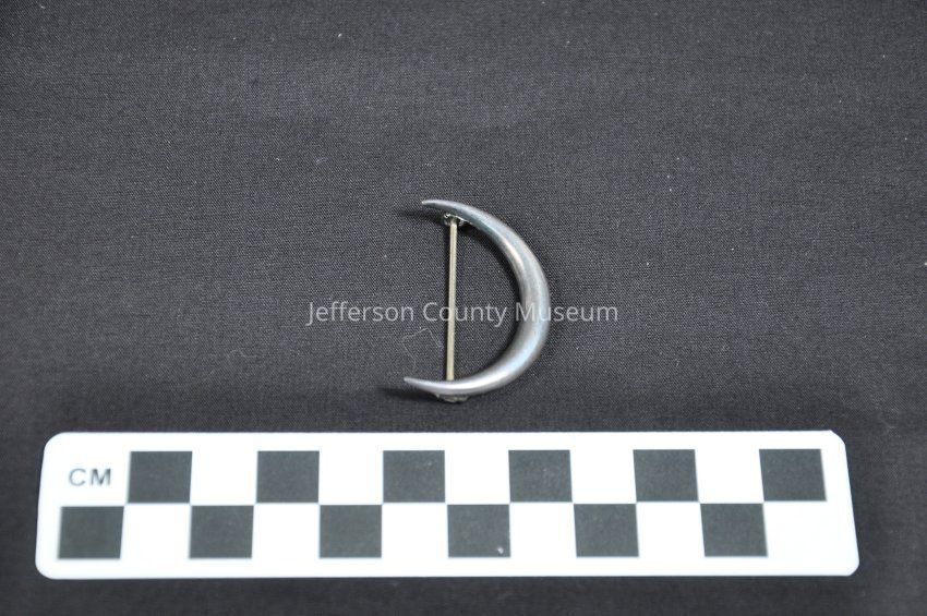 Sterling silver p.in in the shape of a crescent moon. Inscribed on back in script "L.C.B. June 3, 1903".