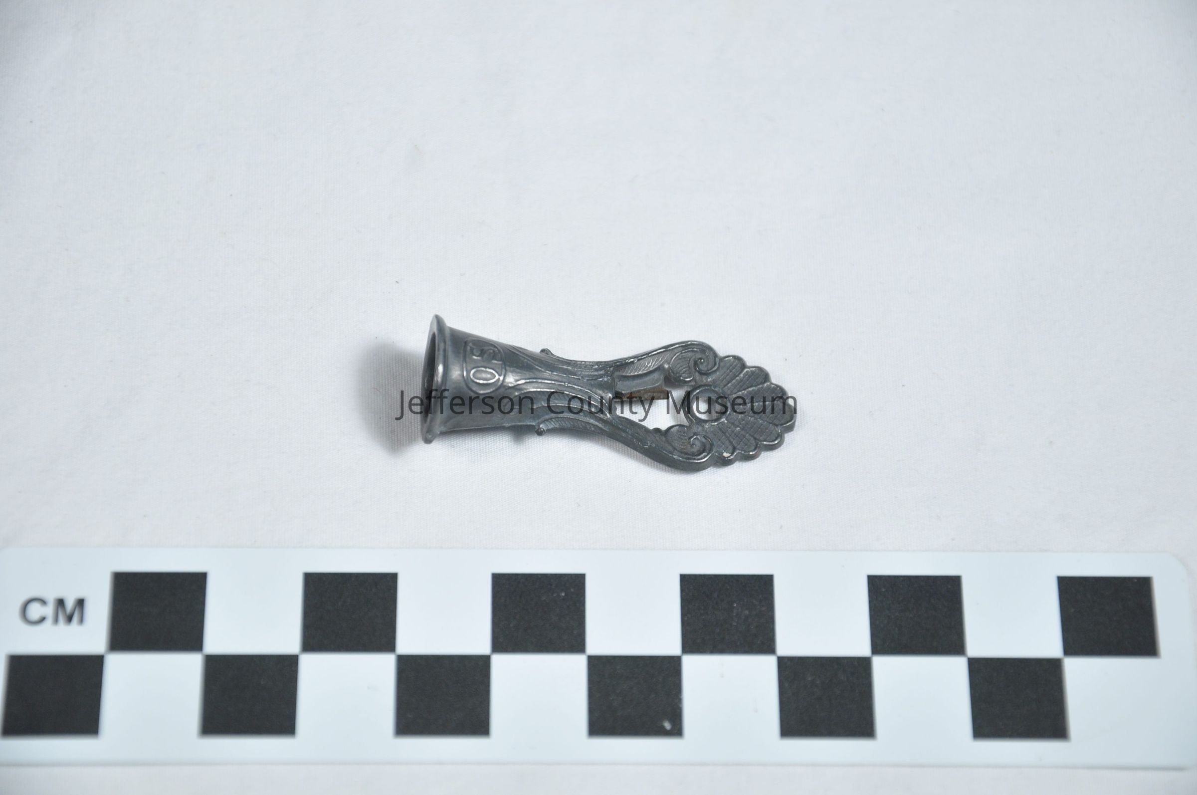 Pewter pencil sharpener. Chinese characters inside an oval on handle. The letters "OS" or alternately "SO" on end near opening for inserting pencil.Acquisition