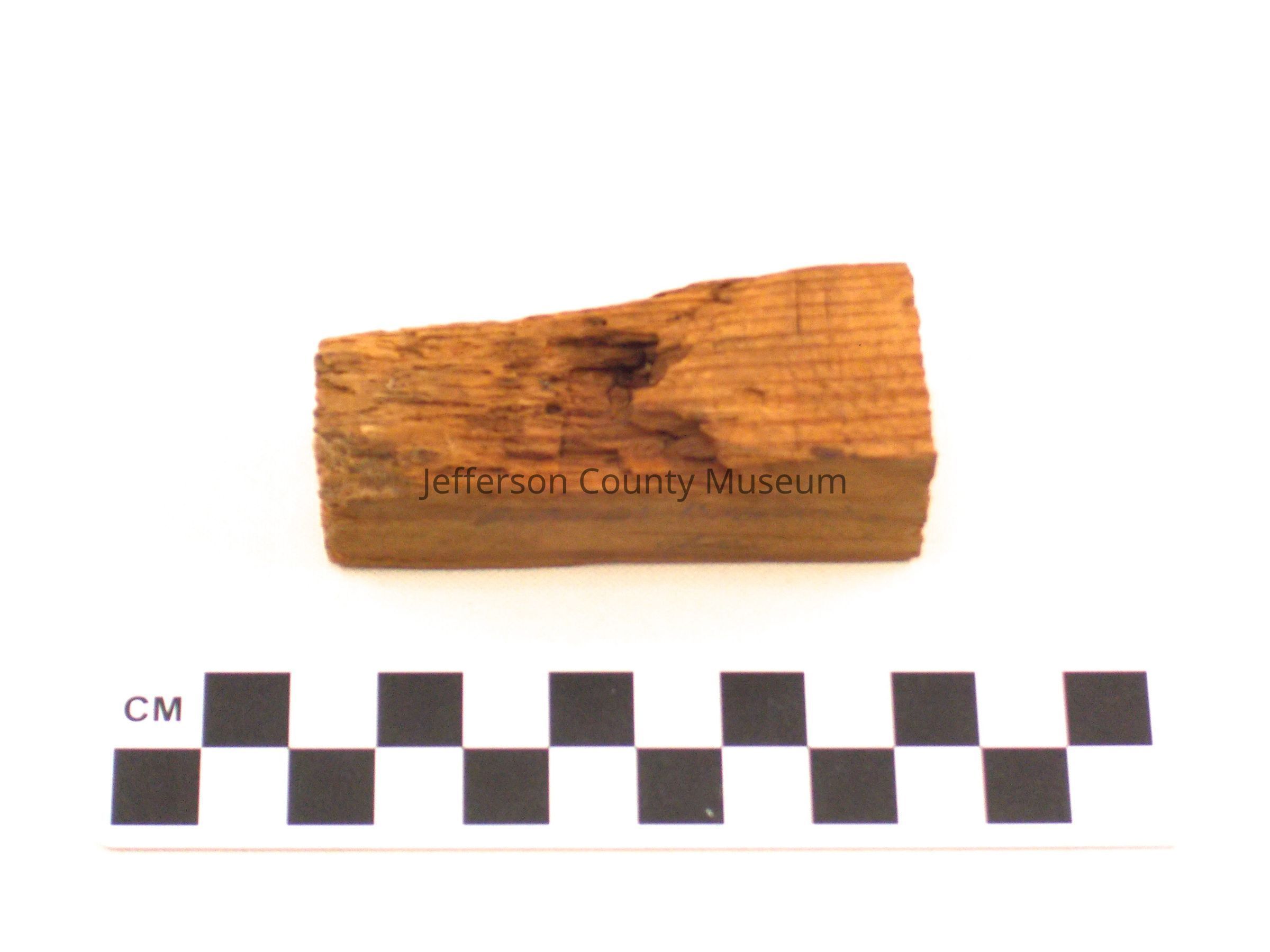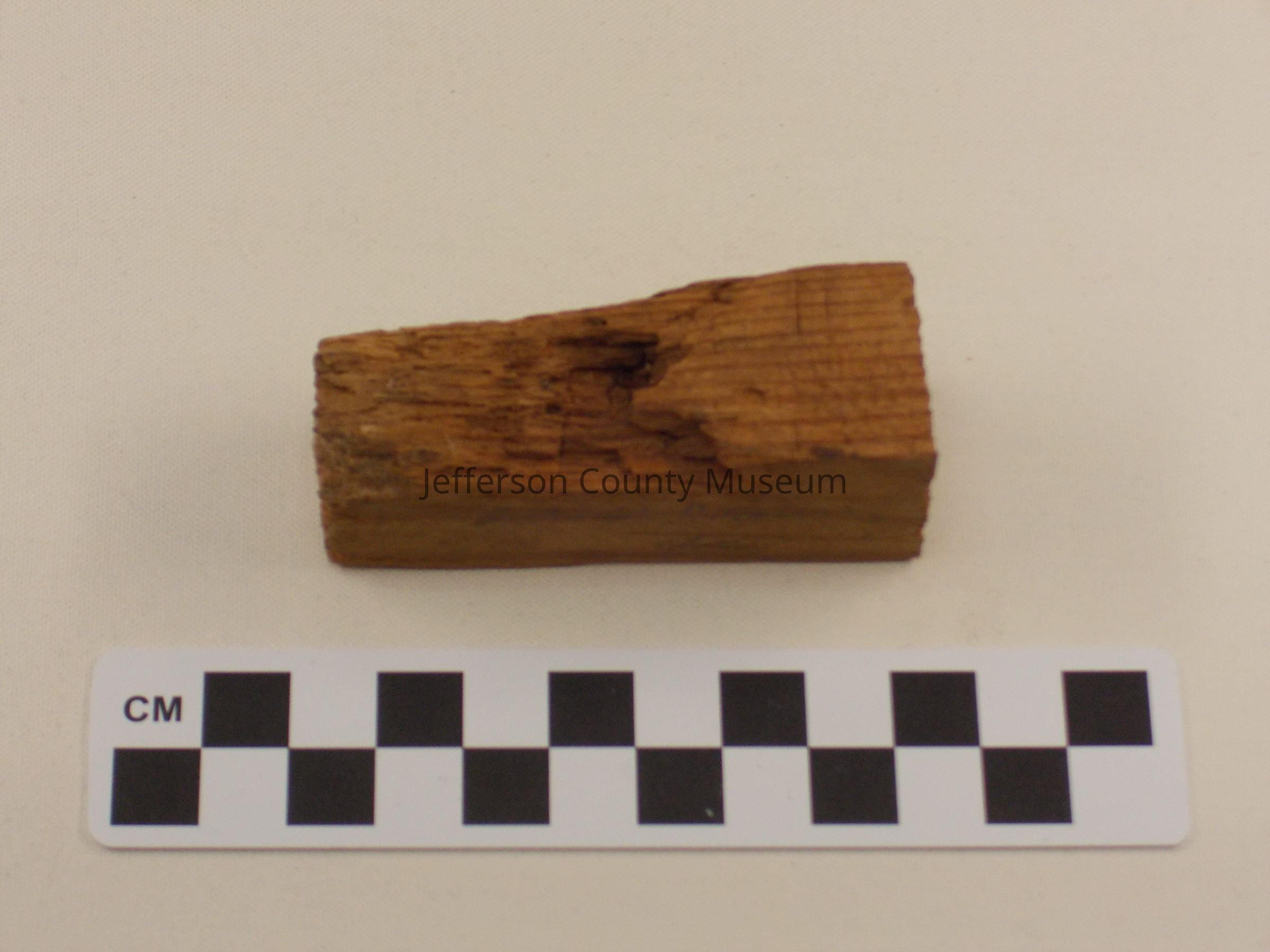 Generally rectangular piece of wood. One side is partially deteriorated.