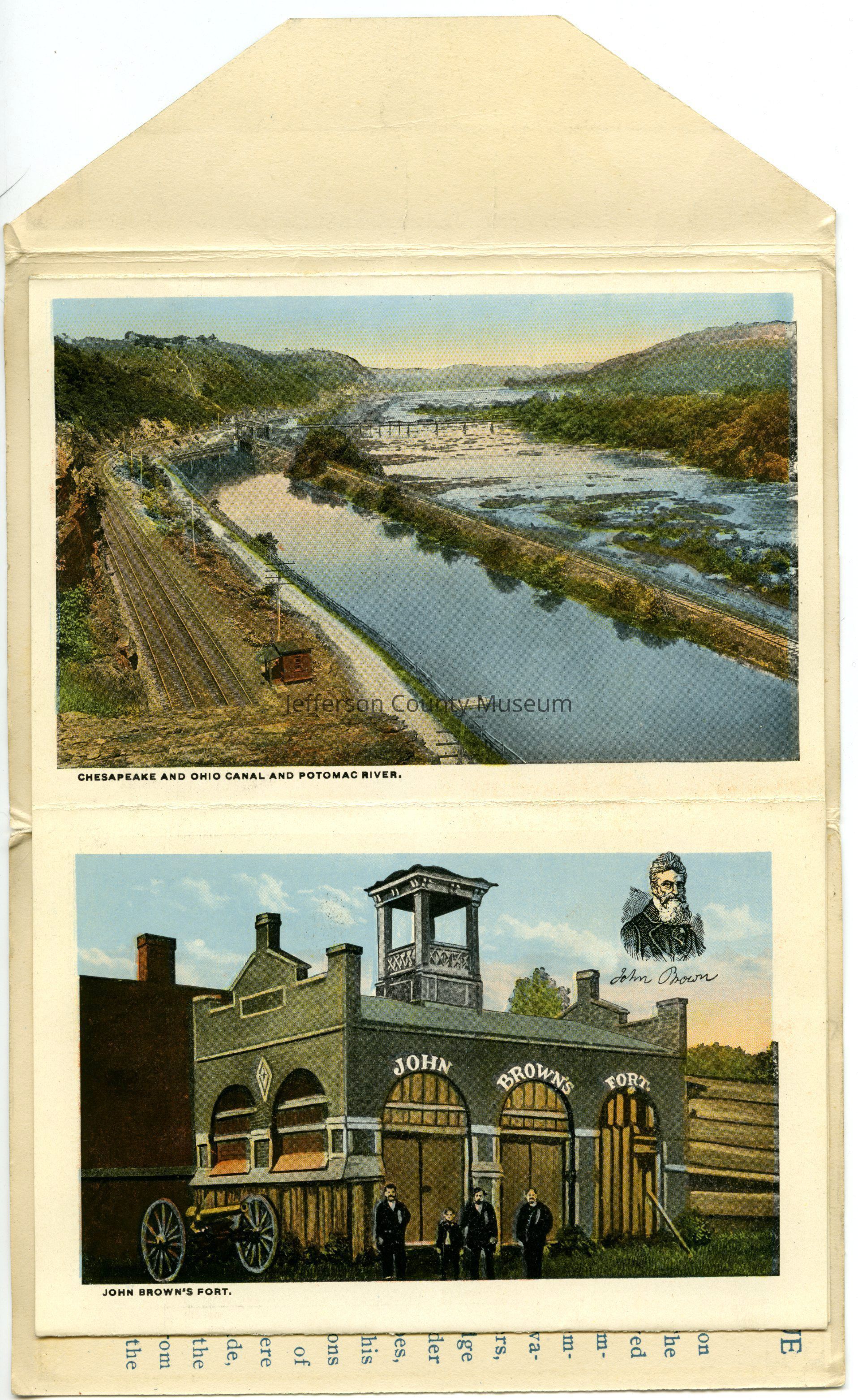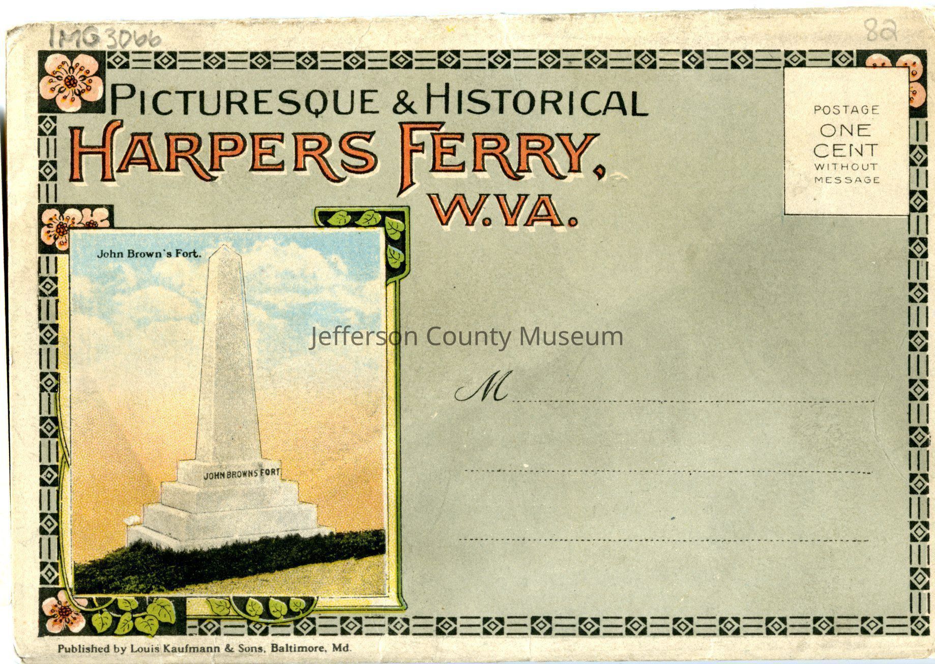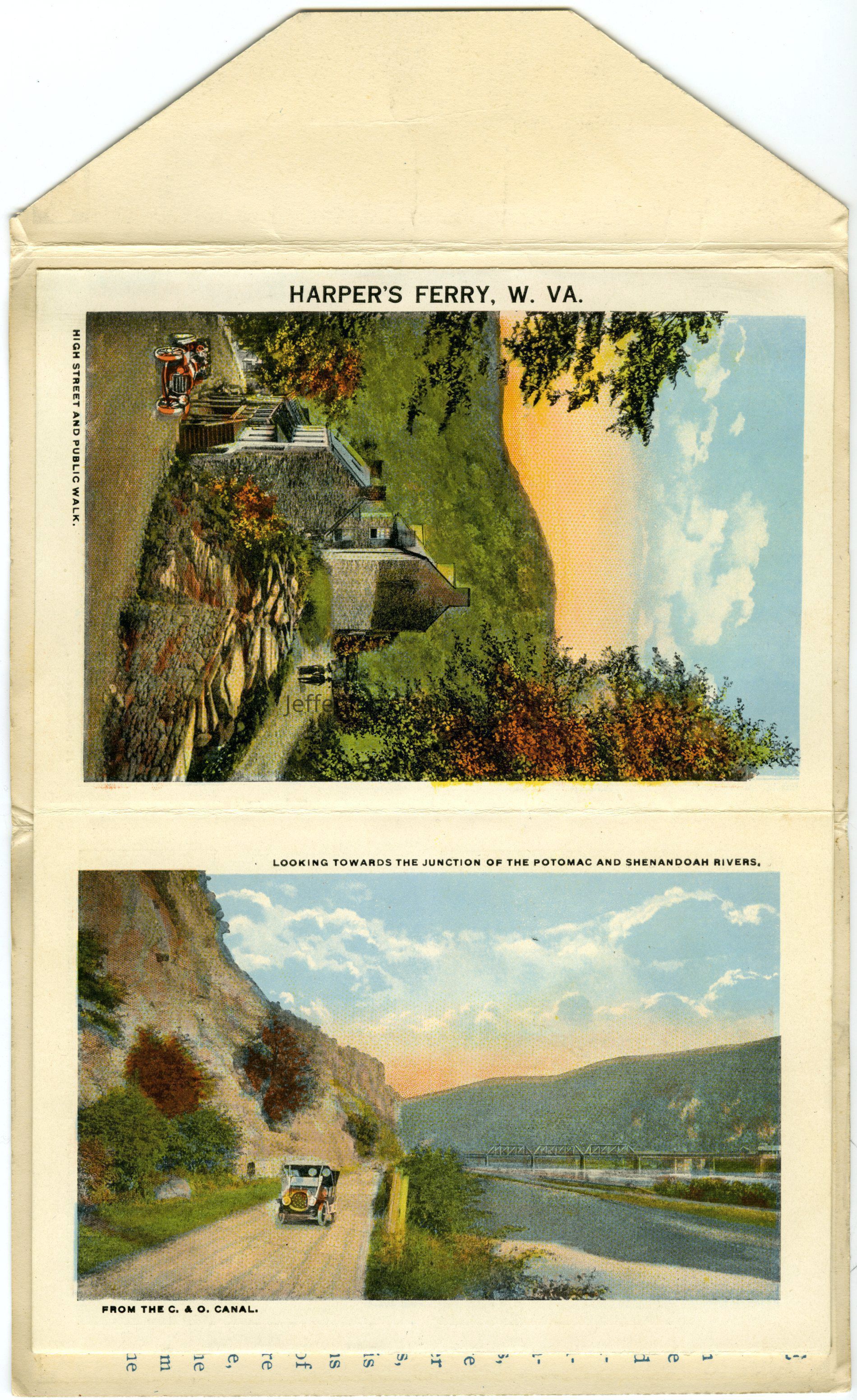 This colored post card contains 26 different scenic pictures of Harpers Ferry. It is fitted with its own envelope, which has a flap and open slot to keep it closed, and an area for postage and a mailing address. Each side of the outside of the envelope includes a picture. The side including the postage space has an image titled "John Brown's Fort", and the other side containing the envelope flap has an image titled "John Brown's Fort and Tablets, Harpers Ferry, W. VA." On the inner side of the envelope, there is a descriptive message printed containing a brief history of Harpers Ferry.