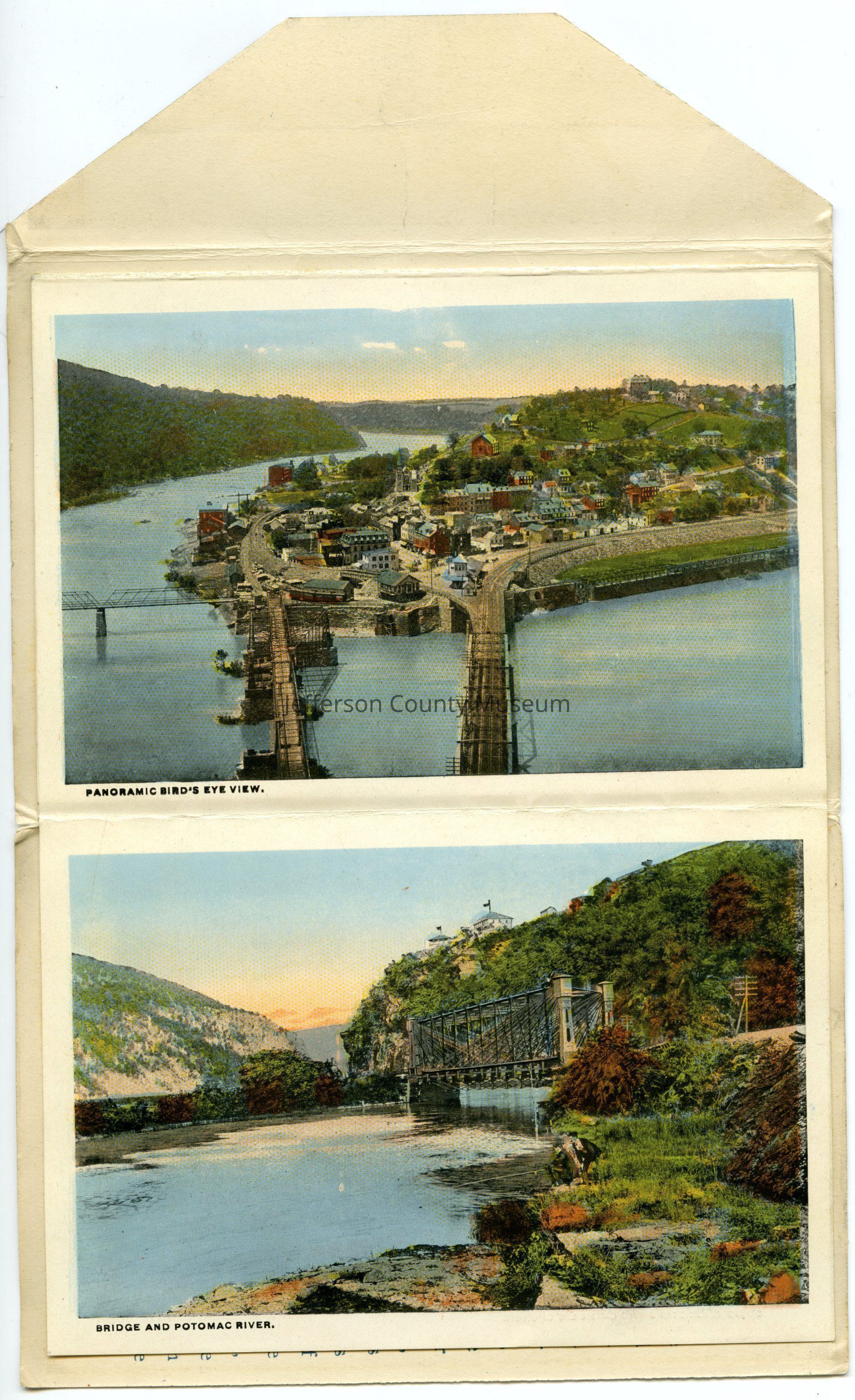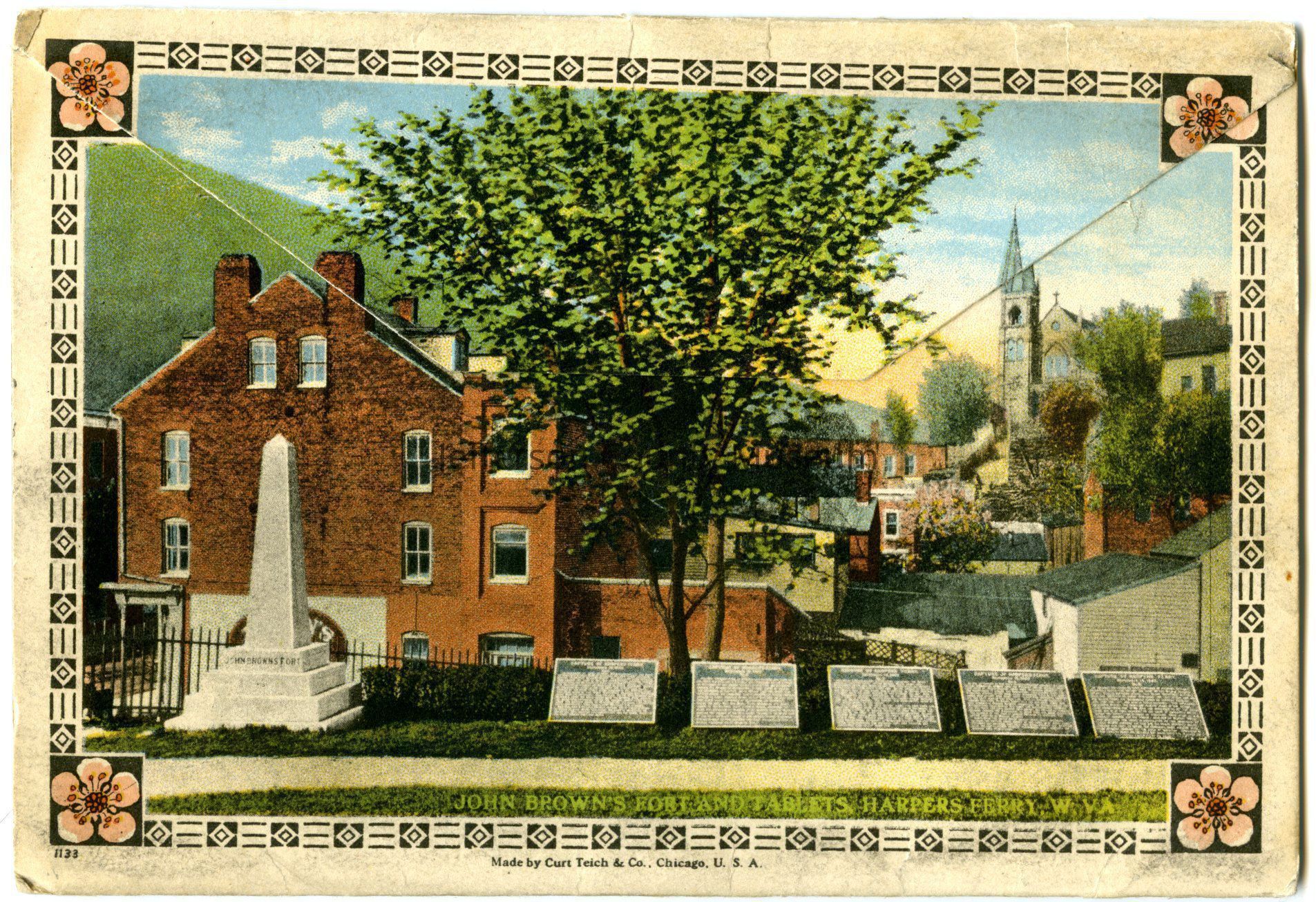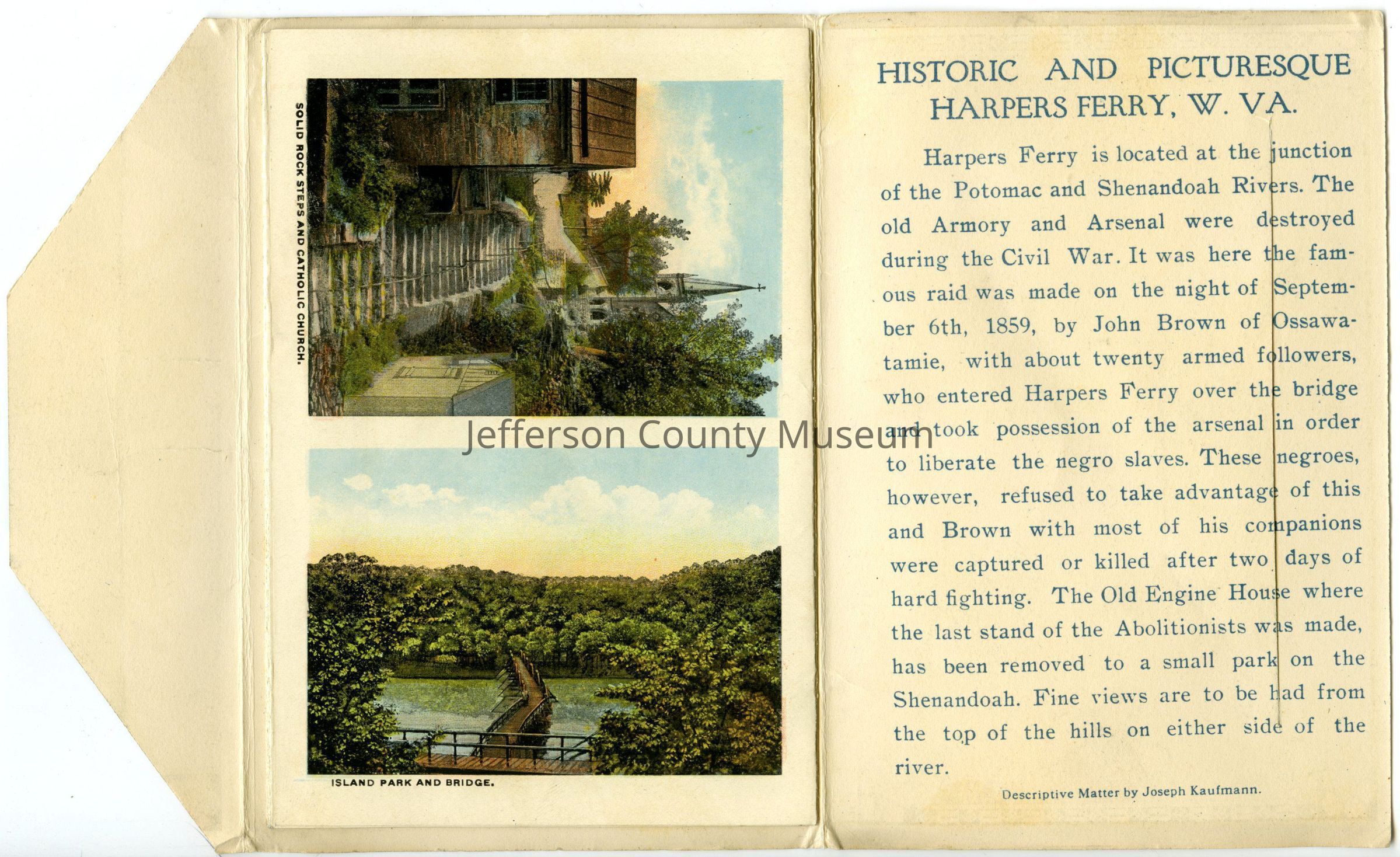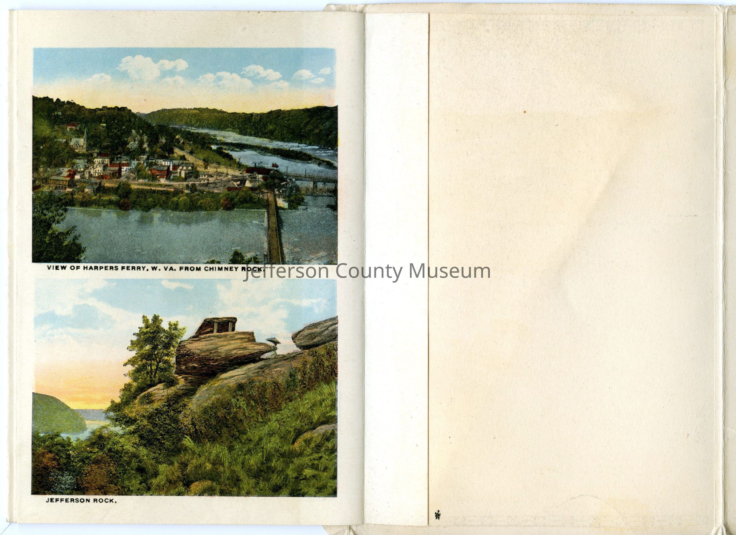 This colored post card contains 26 different scenic pictures of Harpers Ferry. It is fitted with its own envelope, which has a flap and open slot to keep it closed, and an area for postage and a mailing address. Each side of the outside of the envelope includes a picture. The side including the postage space has an image titled "John Brown's Fort", and the other side containing the envelope flap has an image titled "John Brown's Fort and Tablets, Harpers Ferry, W. VA." On the inner side of the envelope, there is a descriptive message printed containing a brief history of Harpers Ferry.