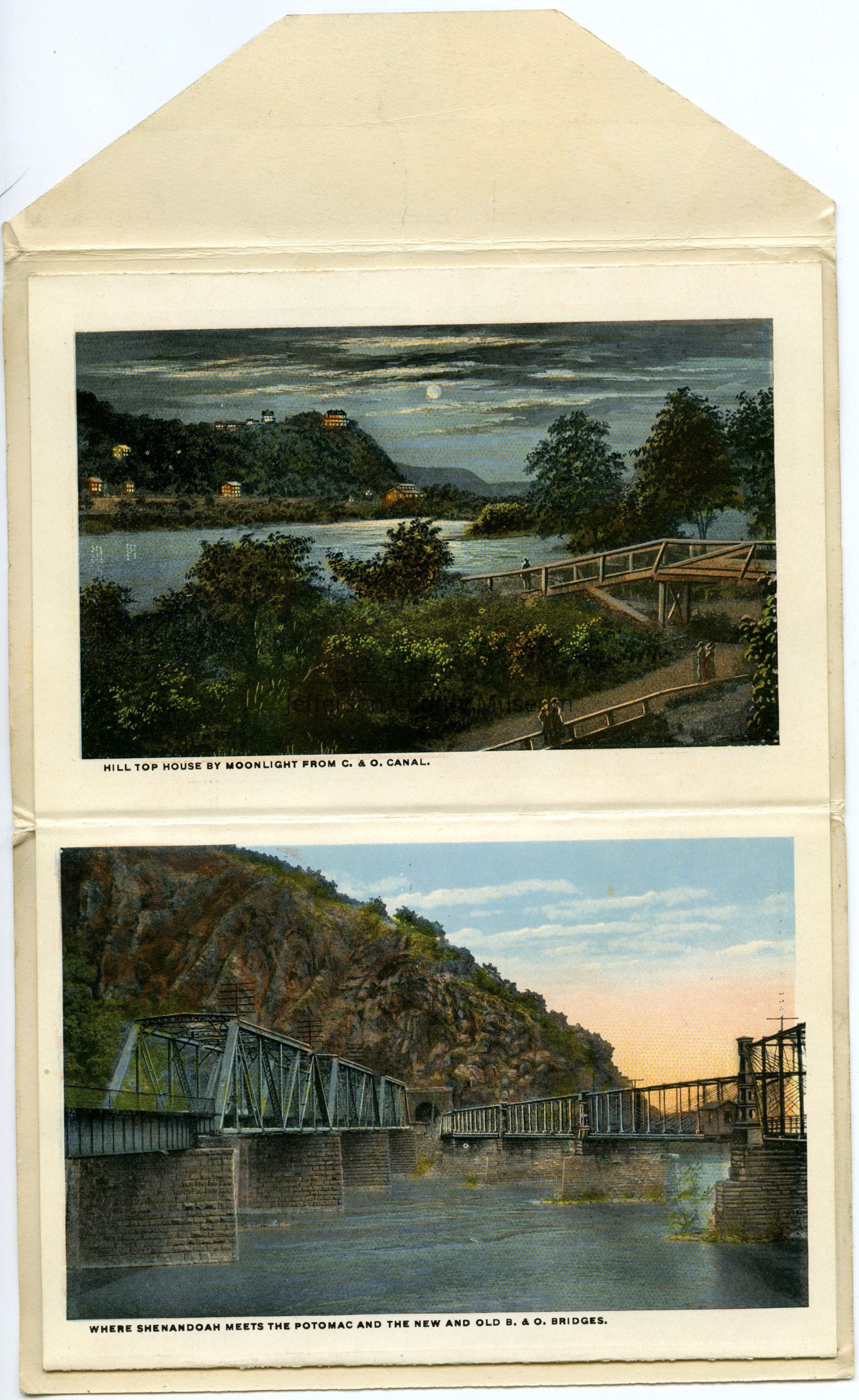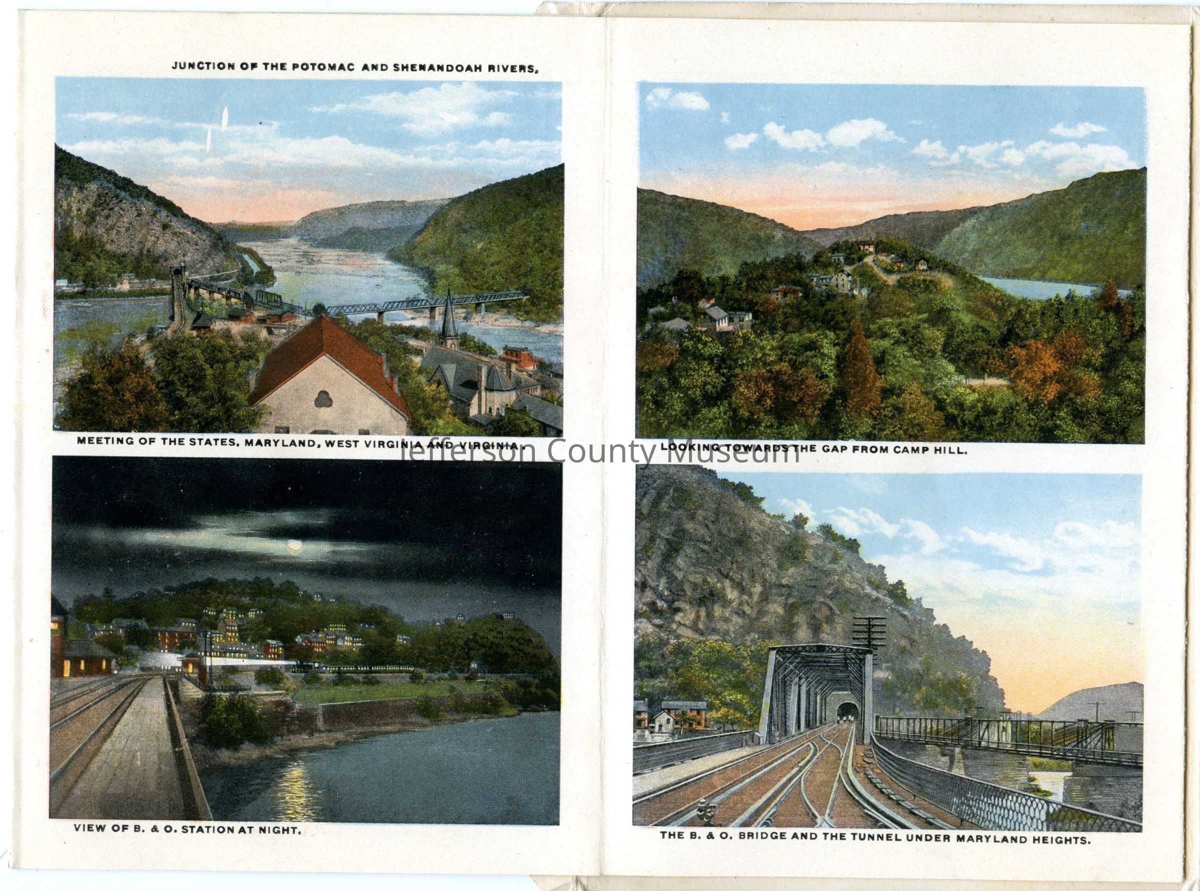 Catalog image 10: Meeting of the States, Maryland, West Virginia, and Virginia; View of B. & O. Station at Night; Looking Towards the Gap from Camp Hill; The B. & O. Bridge and the Tunnel Under Maryland Heights