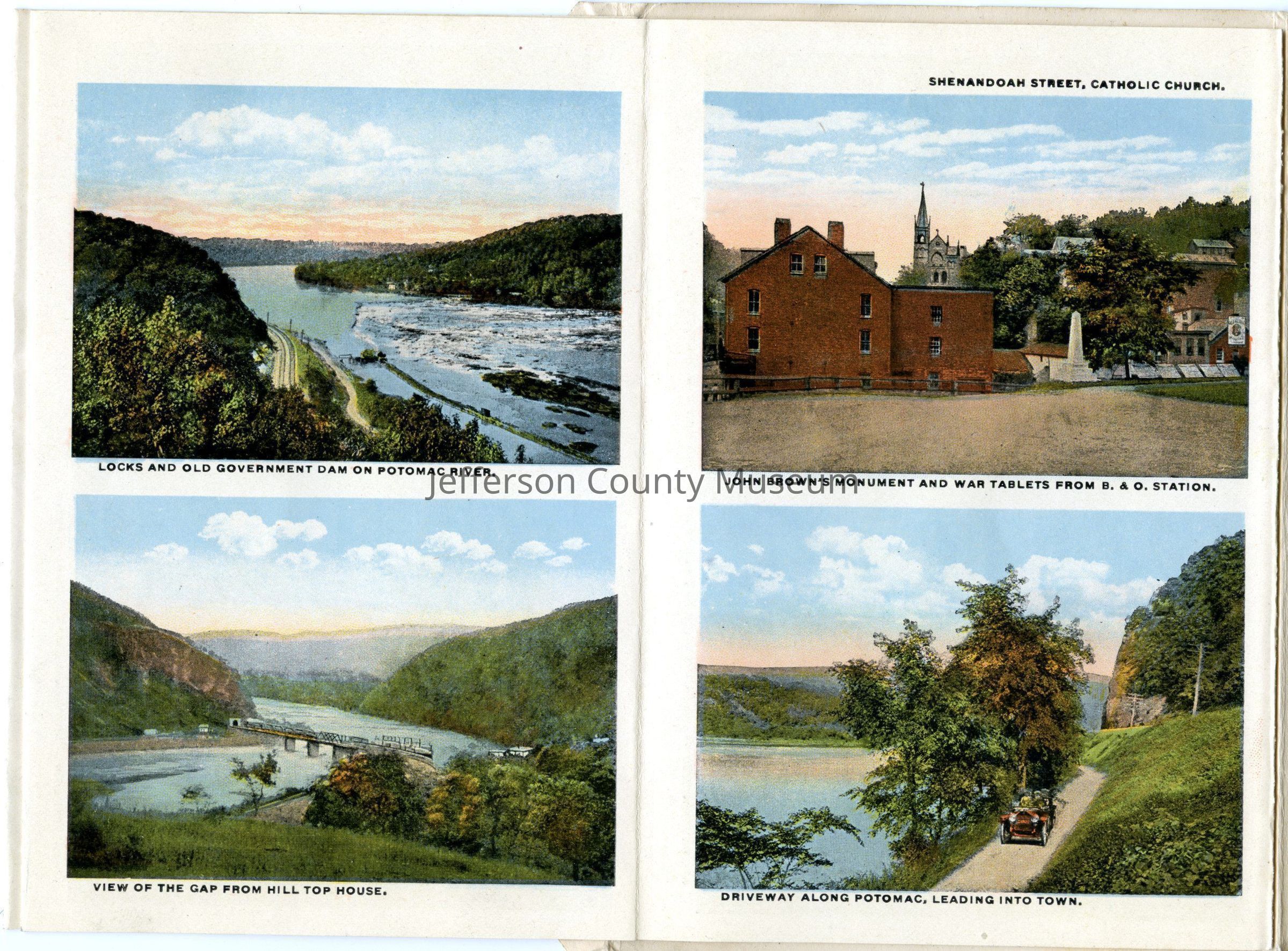 Catalog image 9: Locks and Old Government Dam on Potomac River; View of the Gap from Hill Top House; John Brown's Monument and War Tablets from B. & O. Station; Driveway Along Potomac, Leading into Town