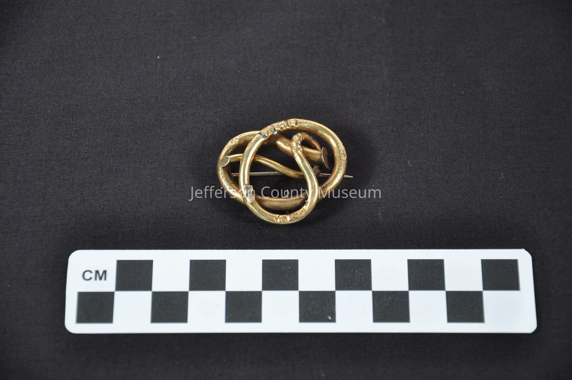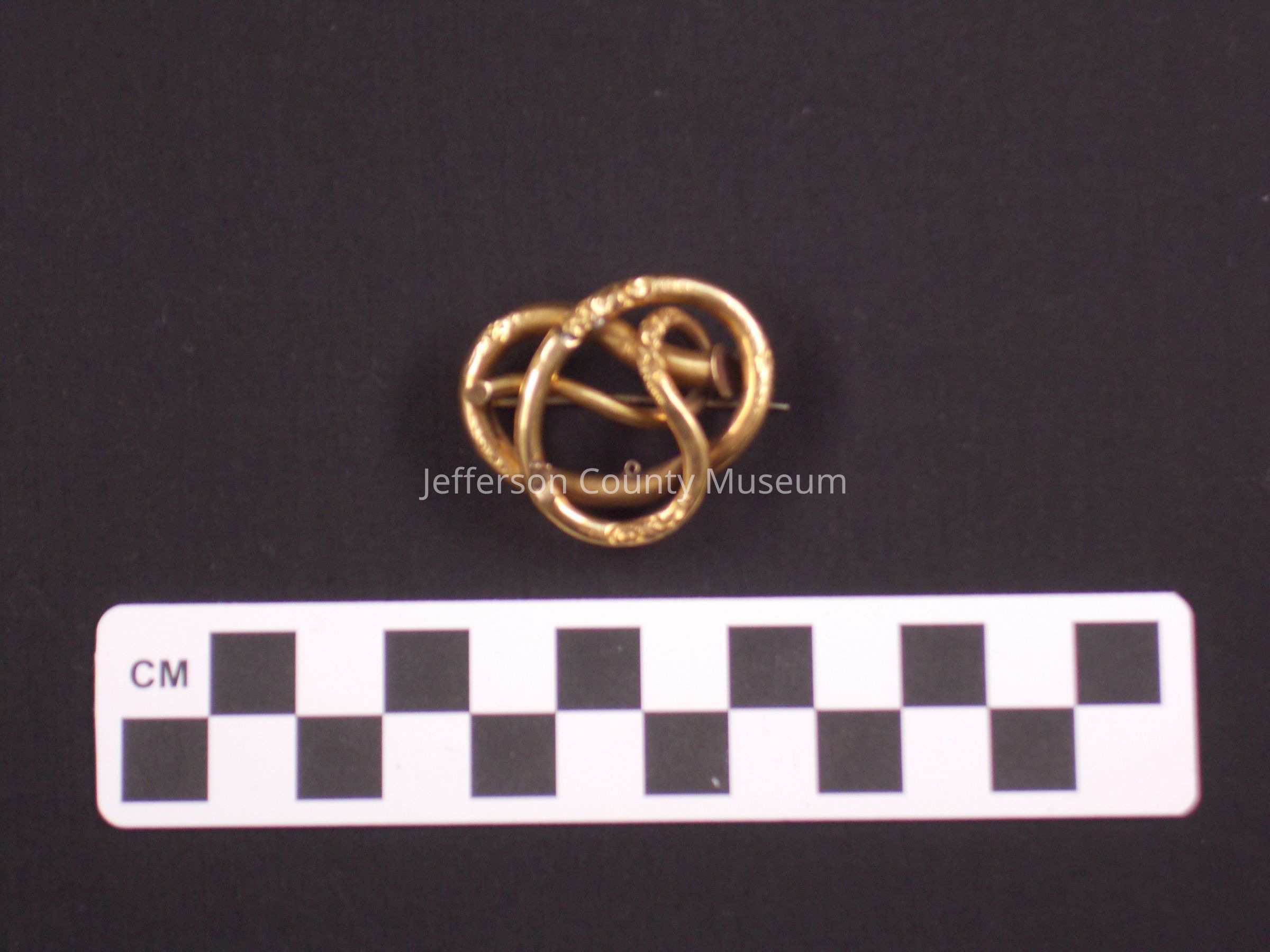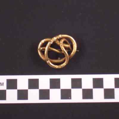 14 carat gold pin in a many-twisted design of hollow tubular open work which is entwined and has an embossed floral design. There is a pin on the back.