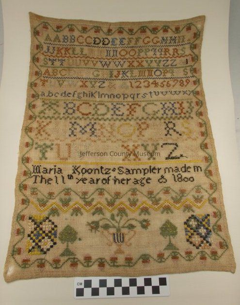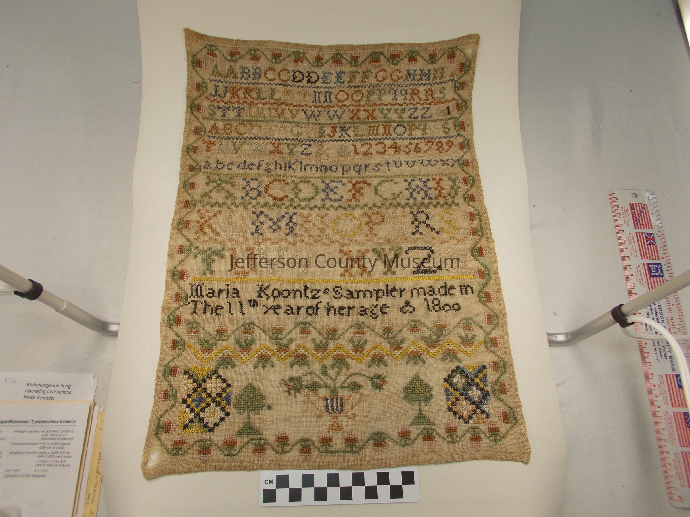 Cloth sampler made of linen, cotton or wool. Background is natural tan color with brown, green, blue, tan and black thread. Has alphabet in capitals and lower case and numbers 1 through 9. At bottom in black is "Maria Koontz's Sampler made The 11th year of her age 1800".Acquisition