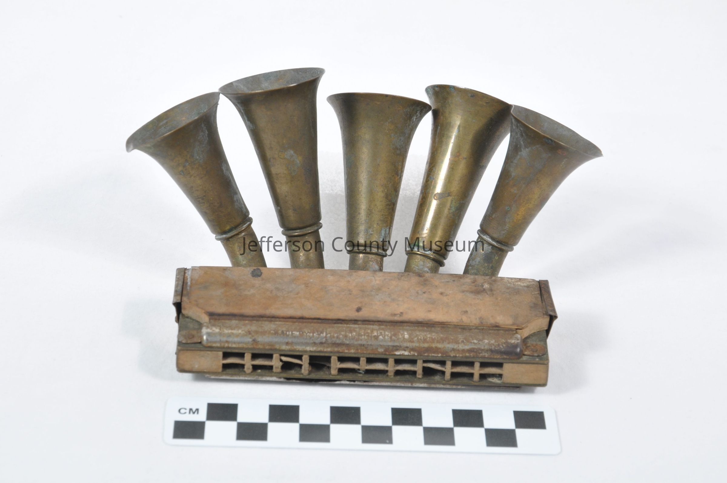 Harmonica has five small brass horns attached to increase sound. The sides of the harmonica are made of wood. A piece of tin is screwed onto each end. Near the mouthpiece on each side is "MADE BY M. HOHNER GERMANY".Acquisition
