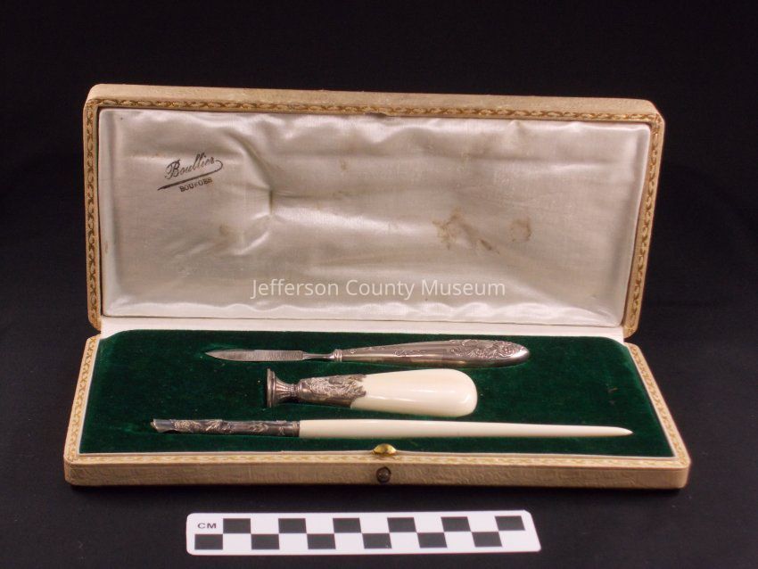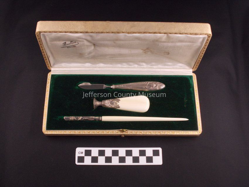 Desk set of pen, letter opener and letter sealer for wax seals. The pen has a silver tip with ivory handle. The sealer has an ivory handle with silver around the bottom. The letter opener has a bright metal blade with a silver handle. The three items are in an off white leatherette box made for them, lined with green velvet on the bottom and a white padded material on the top. On the white on the inside of the box is "Boullier BOURGES".