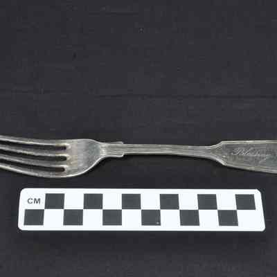 Sterling silver four-tined fork with "Blessing" engraved on handle. Marks on back of handle include a Maltese Cross and possibly a lion's head on either side of "C & S".Acquisition