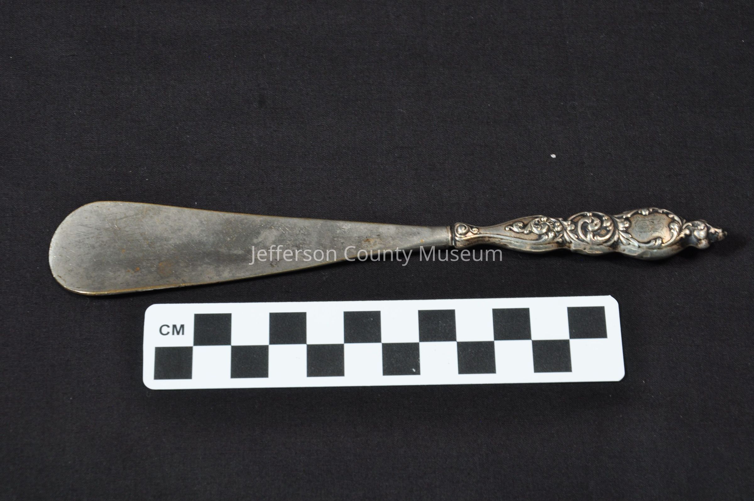 Sterling silver shoehorn with scroll designed hollow handle engraved "LVT". No other marks.