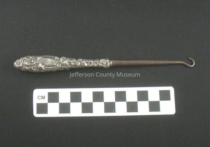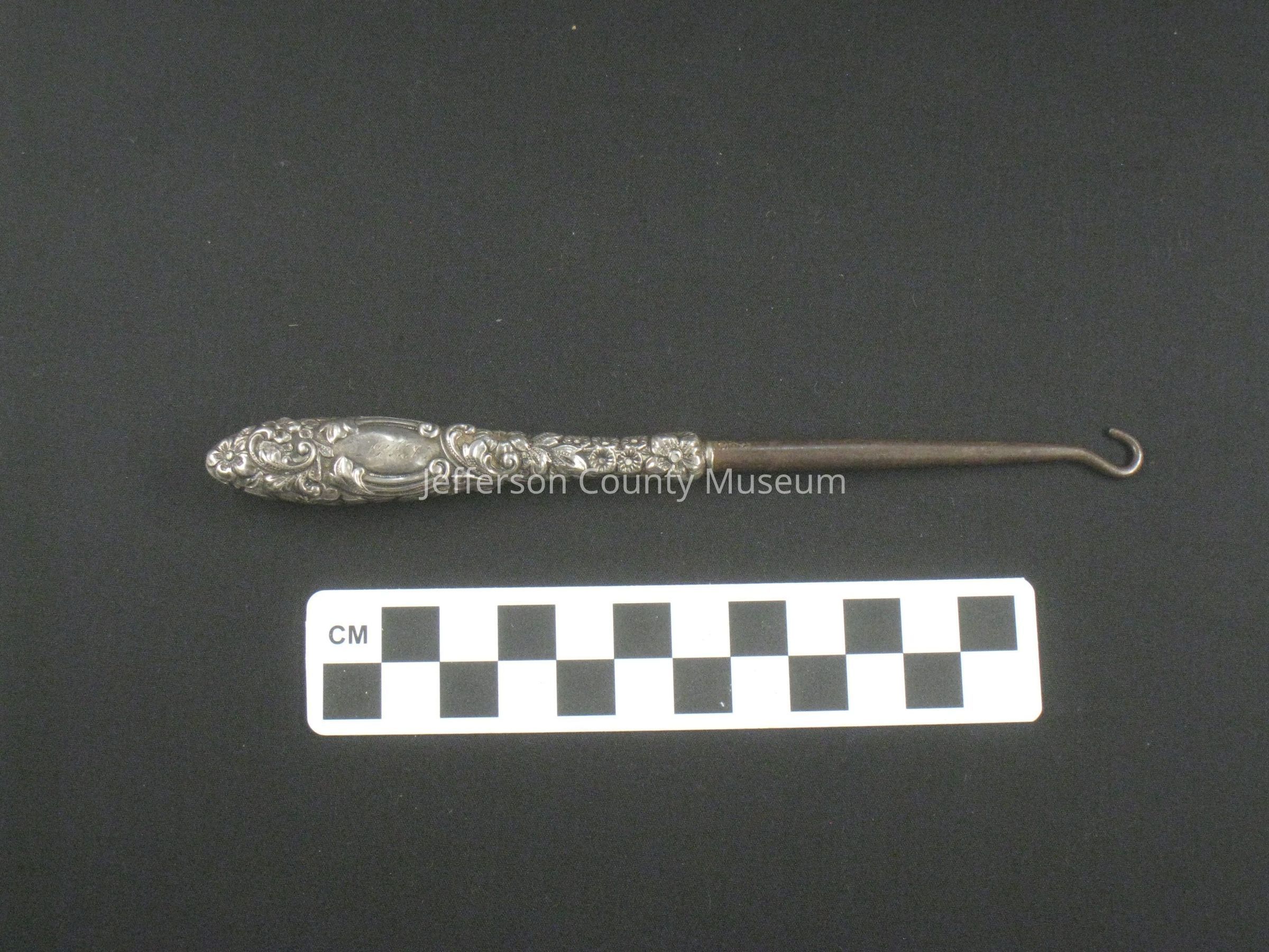 Gorham sterling silver buttonhook with ornate floral design on hollow handle. Engraved on handle "LVT". Makers mark of lion, anchor and "G" stamped on hook near beginning of silver.