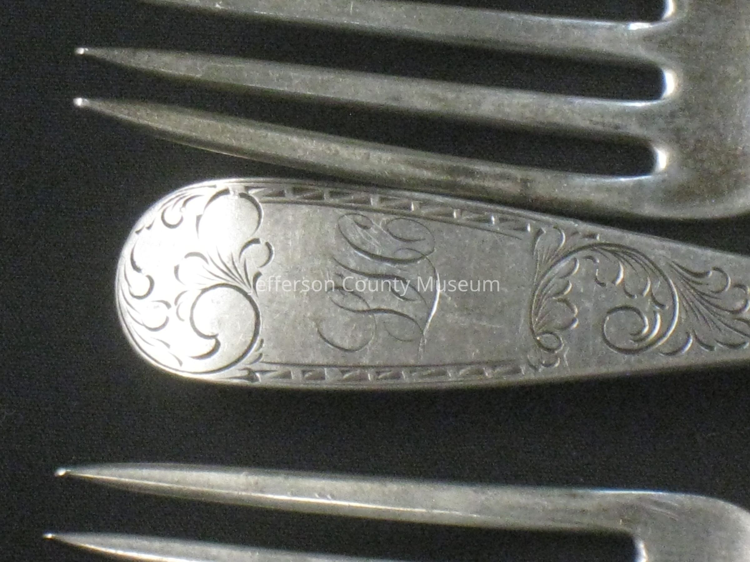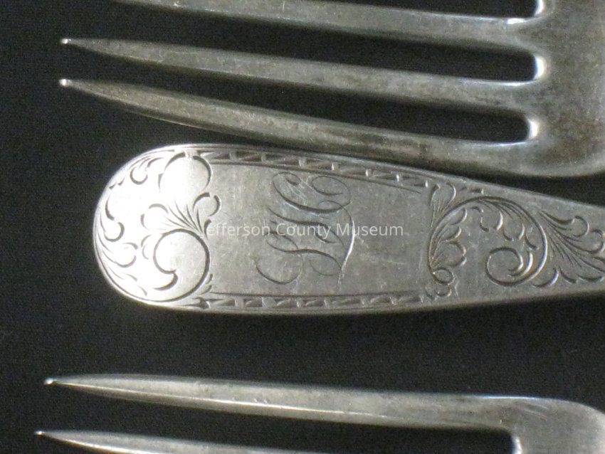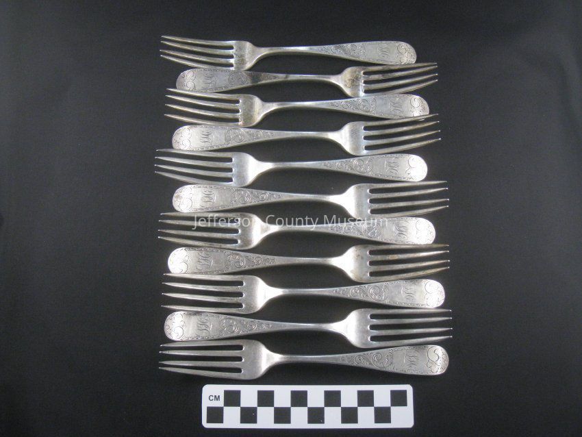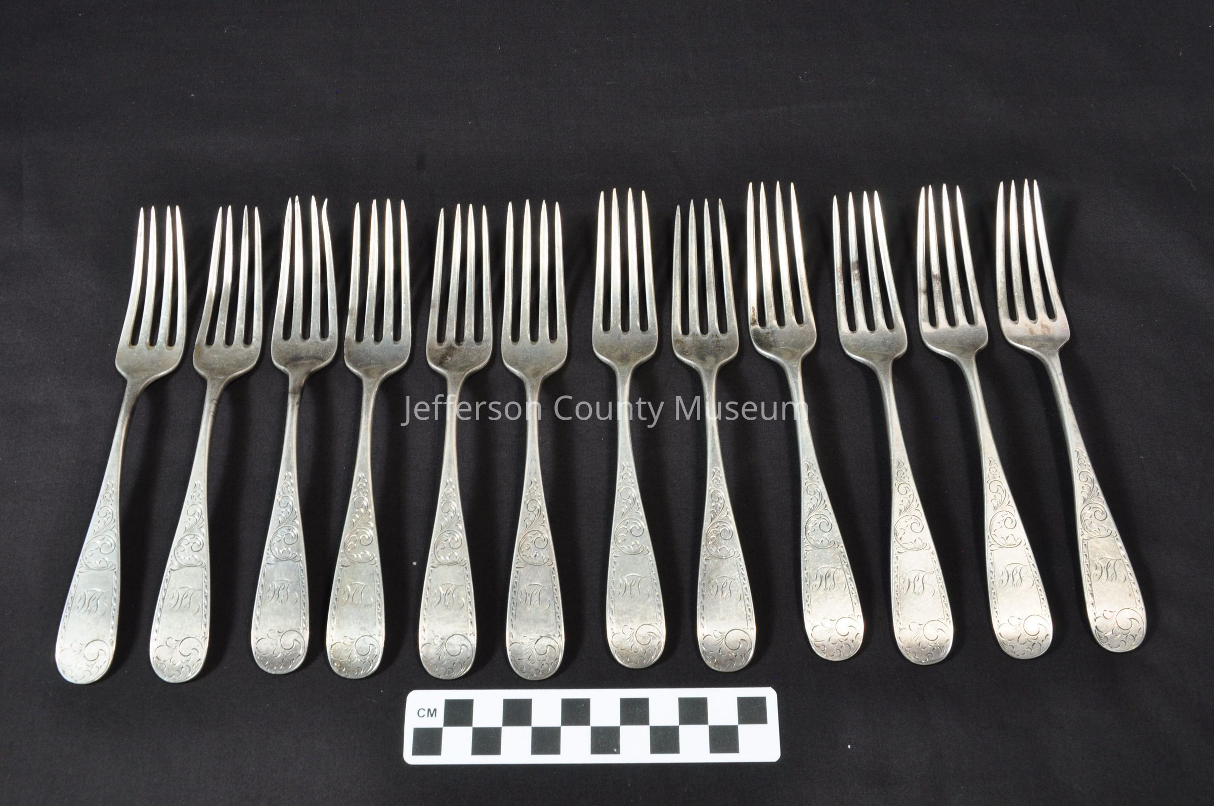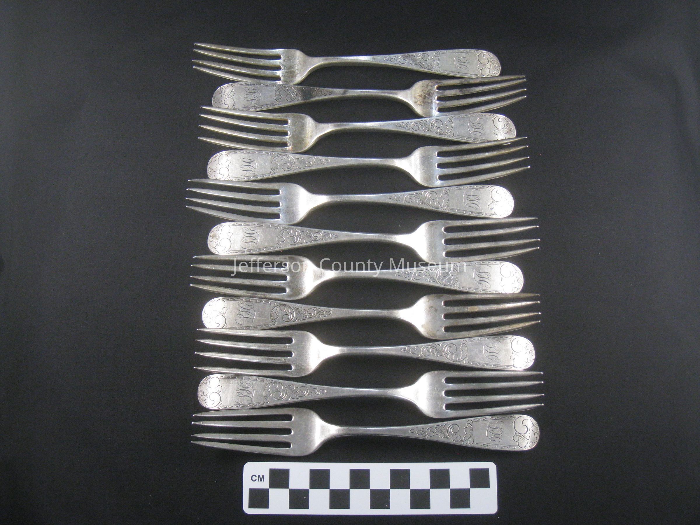 TWELVE sterling silver dinner forks with four tines and simple Mayflower pattern. Each is engraved "LH" on handle. Stamped on back of each "CANFIELD BRO & CO".