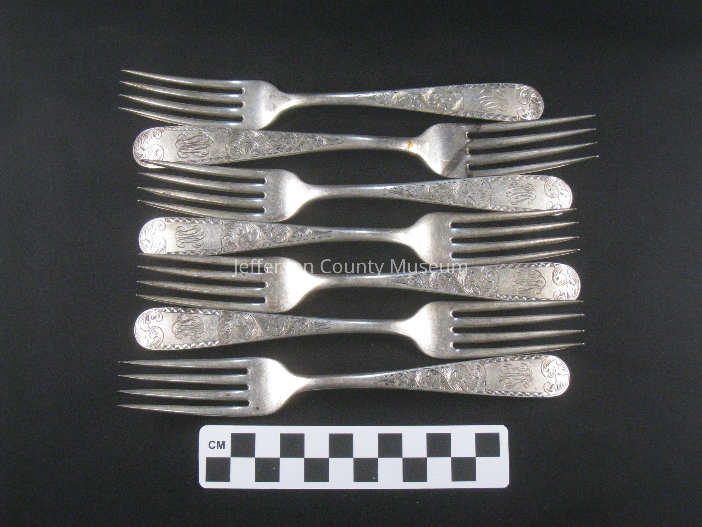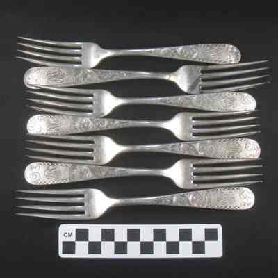 SEVEN sterling silver dinner forks with Mayflower pattern engraved "RMT" on the handle. Stamped on back each (WITH ONE EXCEPTION) "S KIRK & SON 25/1000 STERLING 173M". The exception is stamped "S KIRK & SON STERLING 925/1000 194M".