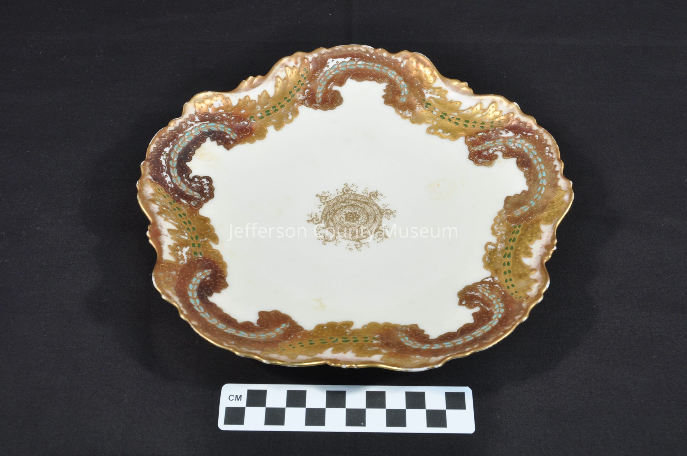 Cream porcelain plate with scalloped edge and heavy decorative leaf design in gold with a gold center medallion. Colors are gold, brown, green and aqua. On back are makers marks. One is green and round with "LIMOGES V.F. FRANCE". The other is blue and round with "L S & S LIMOGES FRANCE".Acquisition