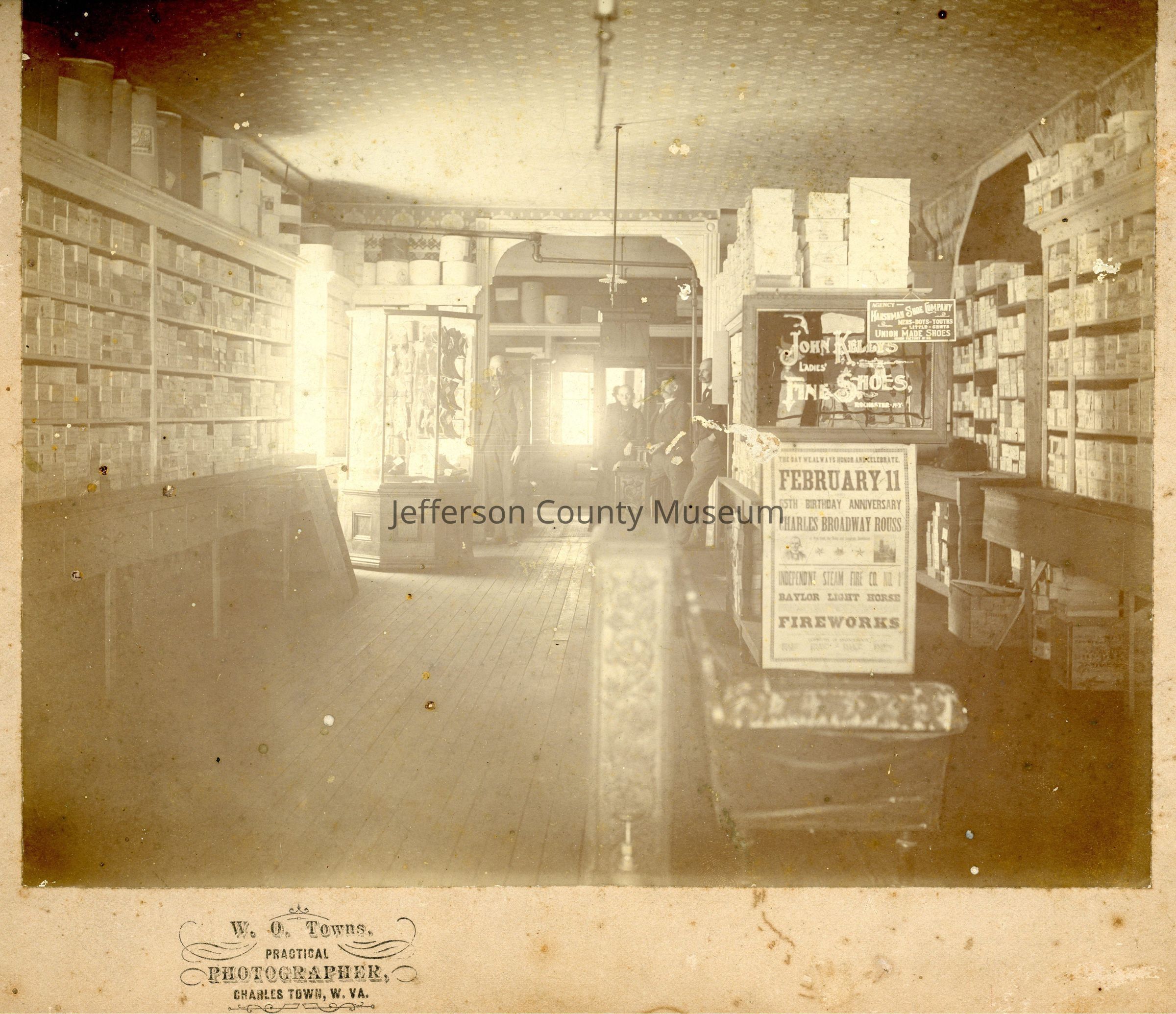 Black and white photo of the interior of Coffman's Dry Goods Store. Likely located at 116 N Charles Street. Visible is a poster advertising a celebration of Charles Broadway Rouss's birthday, signs advertising brands of shoes, and display cases for shoes on either wall. Pictured are the proprietor, Jacob W. Coffman, his sister Annie Coffman, his brother James A Coffman, and an unidentified man.Acquisition