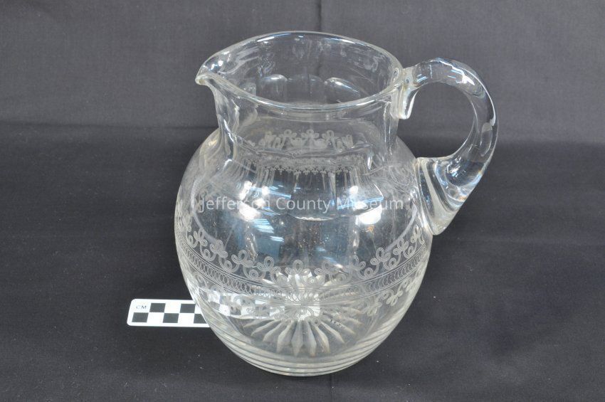 Blown crystal pitcher with flat cuts at neck and etched center band design.
