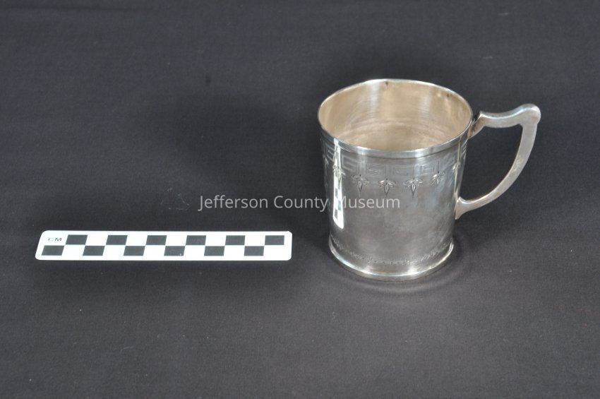 Sterling silver baby cup with leaf and rectangular design at top. Engraved in script is "Grand Ma to L. V. Kennedy. Dec. 25th, 1870". Stamped on bottom is "STERLING 40".