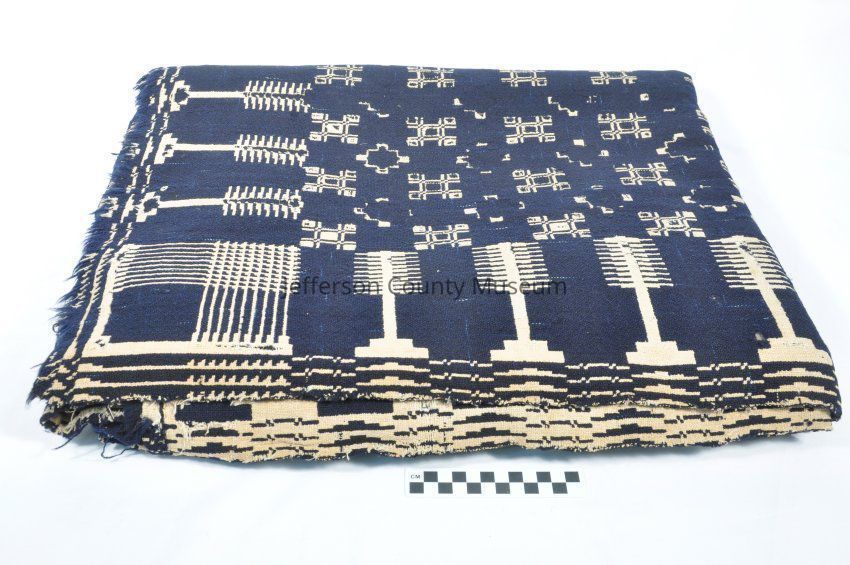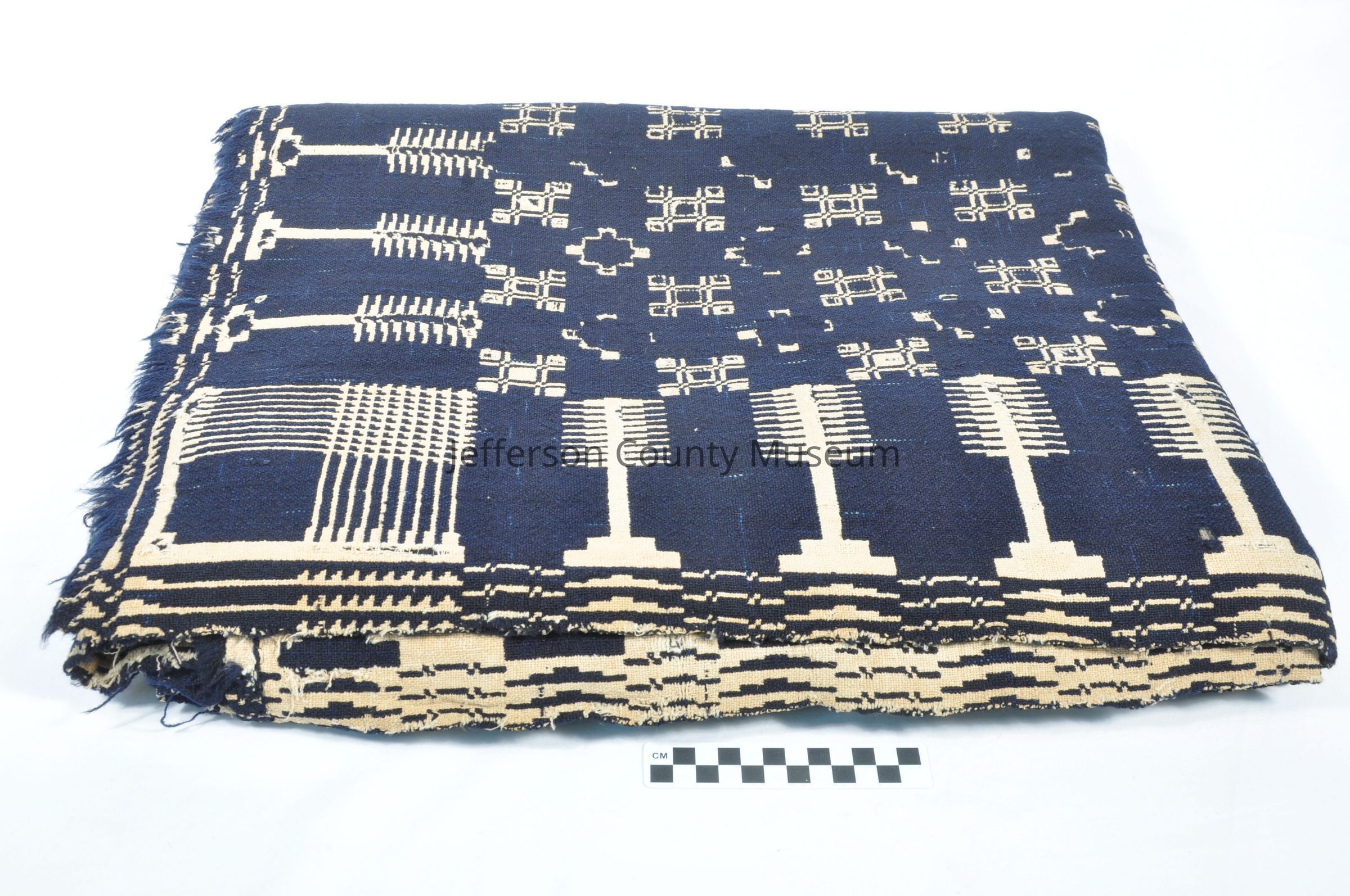 Indigo and beige coverlet made at the Colin Porter Factory, Jefferson County, circa 1860 - 1870. Wool on one side and cotton or linen on other side. Rectangular and Maltese cross designs throughout with an abstract tree design around edges titled "snowball and pine tree" pattern. Coverlet was made in two pieces and hand sewn together in middle.Acquisition