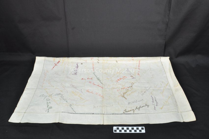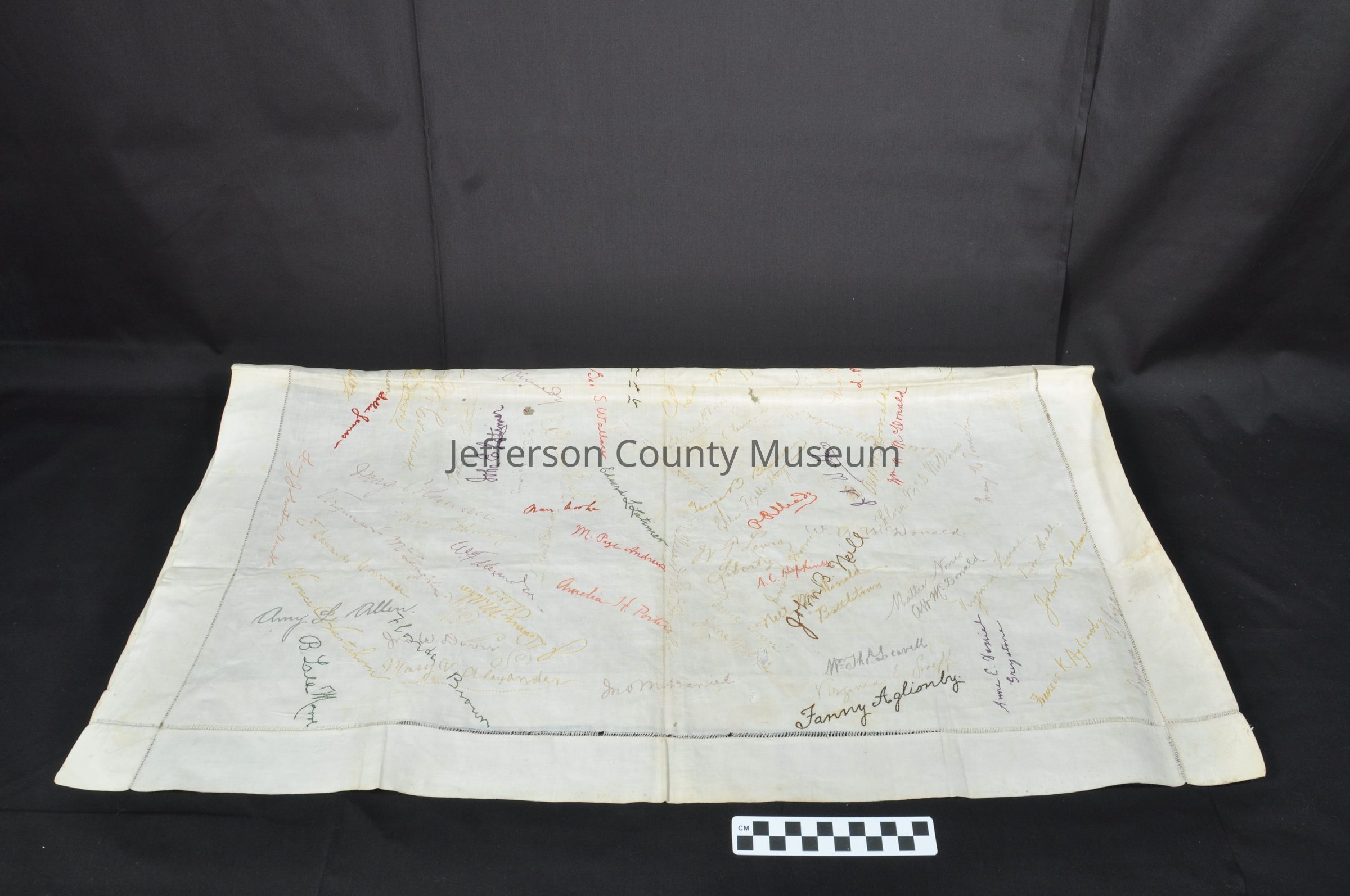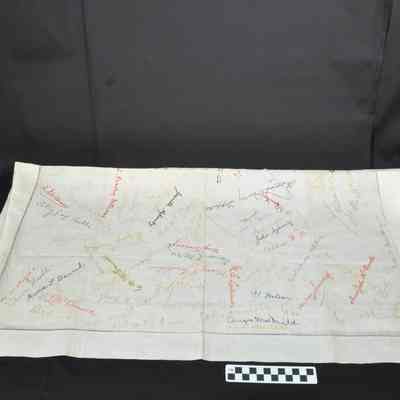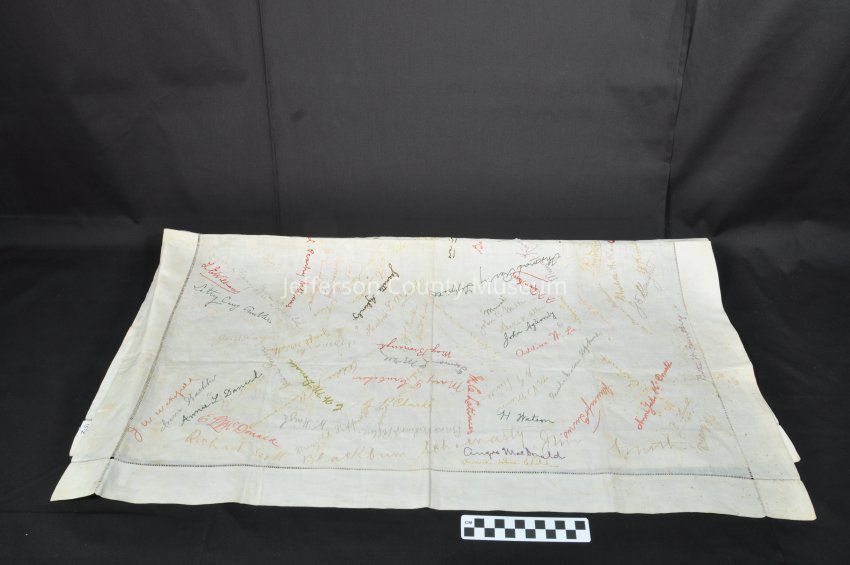 Linen signature cloth. About 100 signatures embroidered in several colors. Two dates are also embroidered on cloth--"4-13-92" and "2-4-94". Among the family names represented are Aglionby, Andrews, Alexander, McDonald, Daniel, Kennedy, Latimer, Wallace, Brown, Lippitt, MacDonald.Acquisition