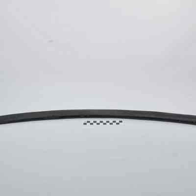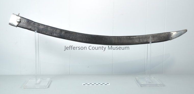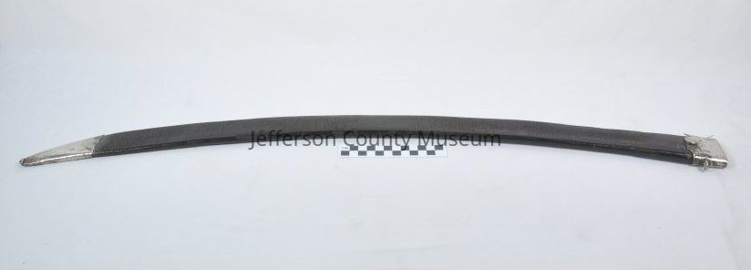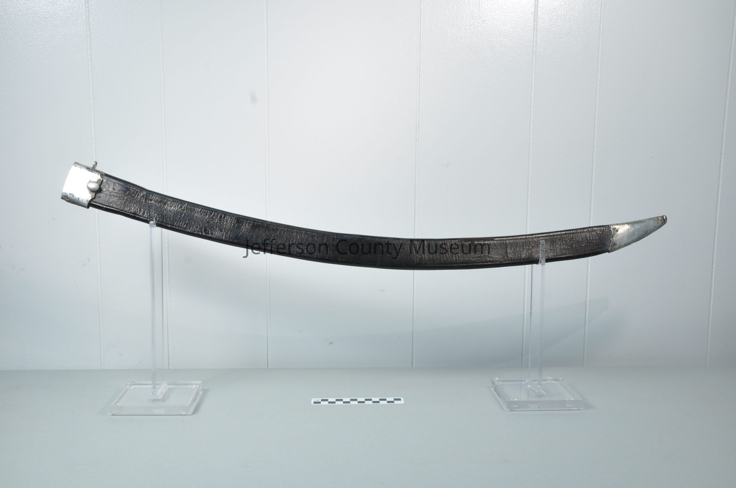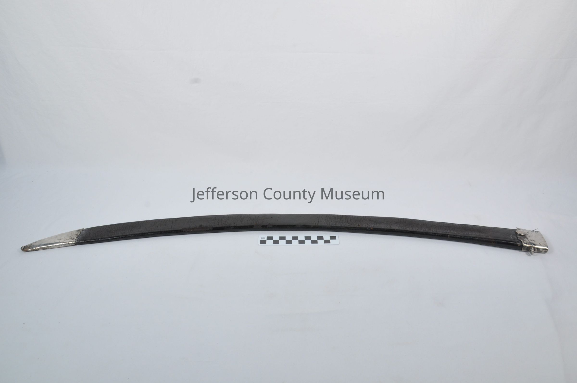 Scabbard for sword (catalog number 216). It is leather with three silver decorations, one on the end, one in the middle and one at the top. The top one has a ring and a grommet, the middle one has a ring and the bottom has fancy cuts on the top end. "14th Brigade" is engraved on the top piece in script.Acquisition