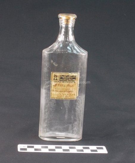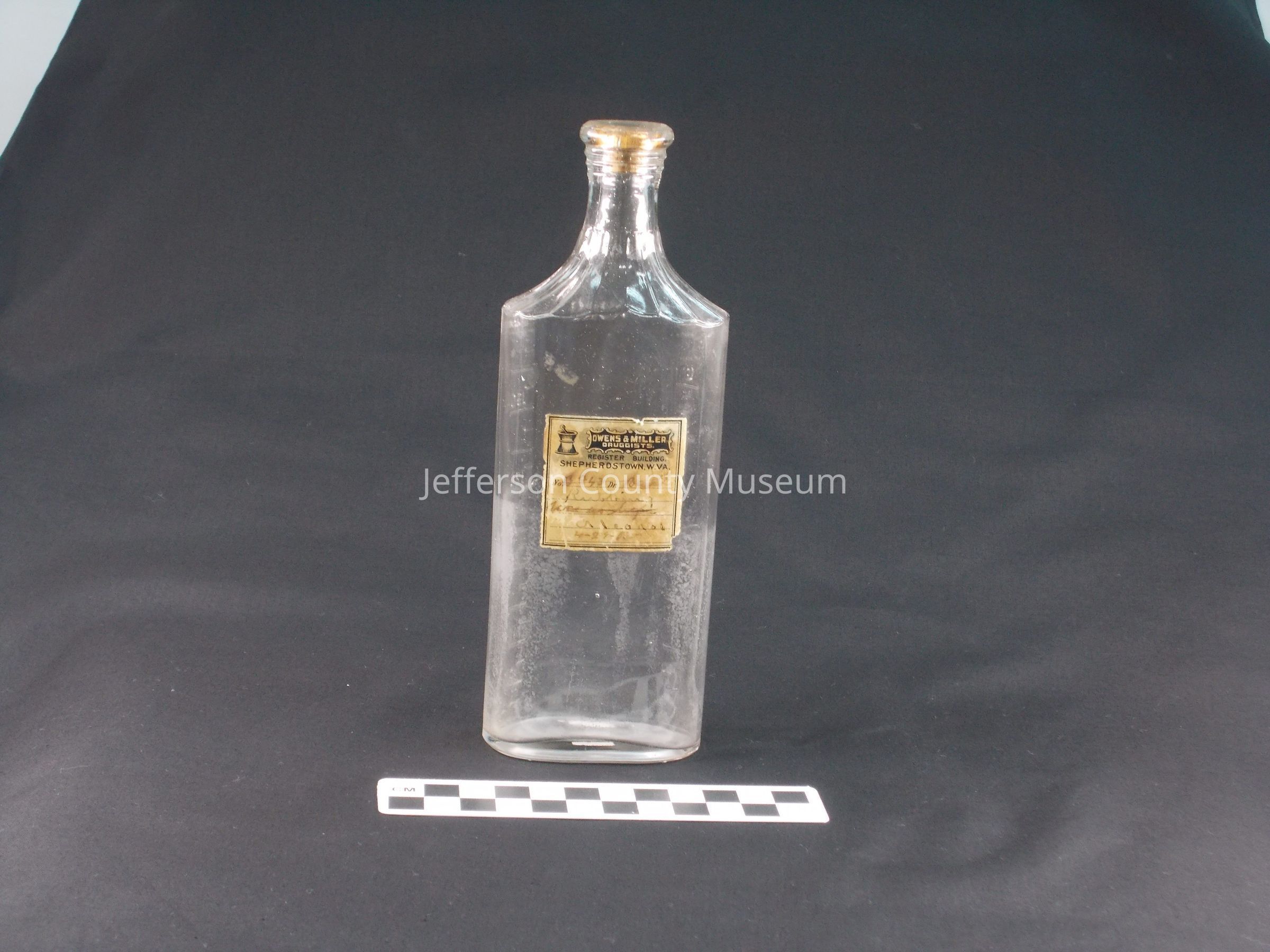 Clear glass pharmacy bottle, flat on one side and rounded on edges of other side. Embossed with cc and oz. Broken off cork in top. Paper label says "OWENS & MILLER DRUGGISTS. REGISTER BUILDING SHEPHERDSTOWN, W. VA." Handwritten date at bottom of label may be "4-29-12".Acquisition