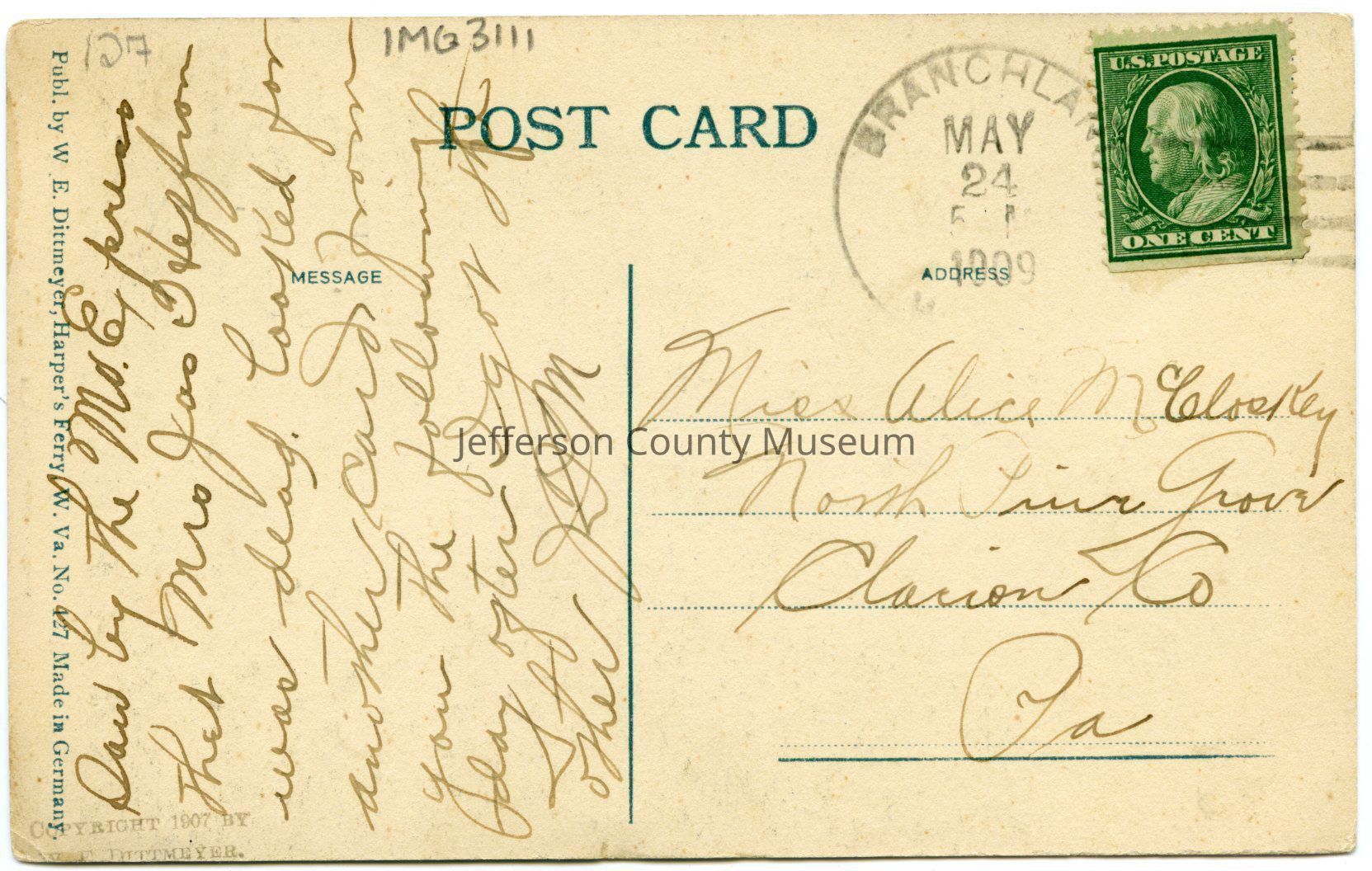 Post-marked May 24, 1909, city/state illegible.Acquisition