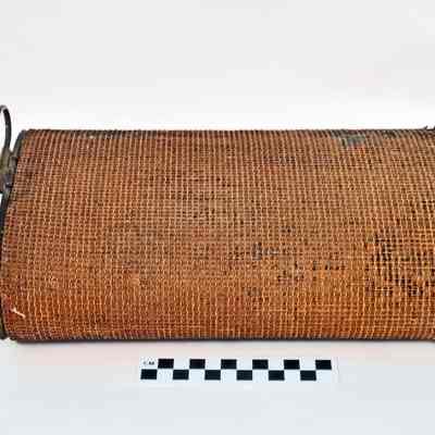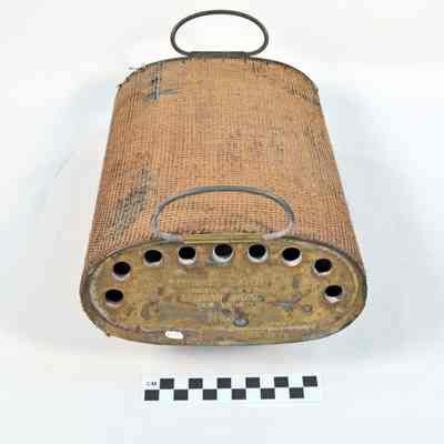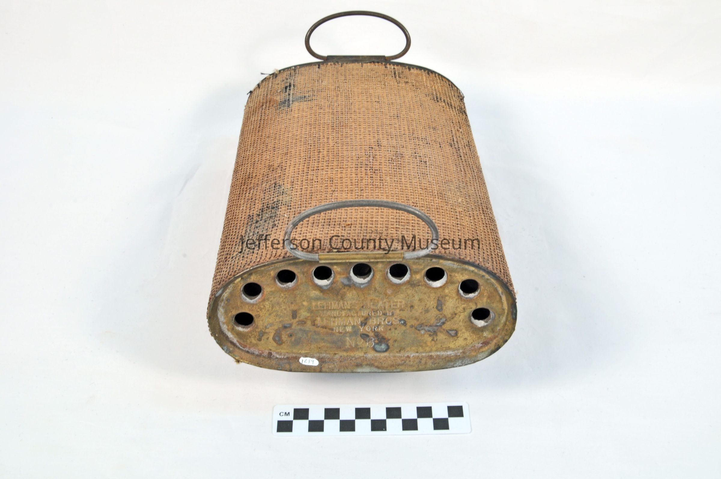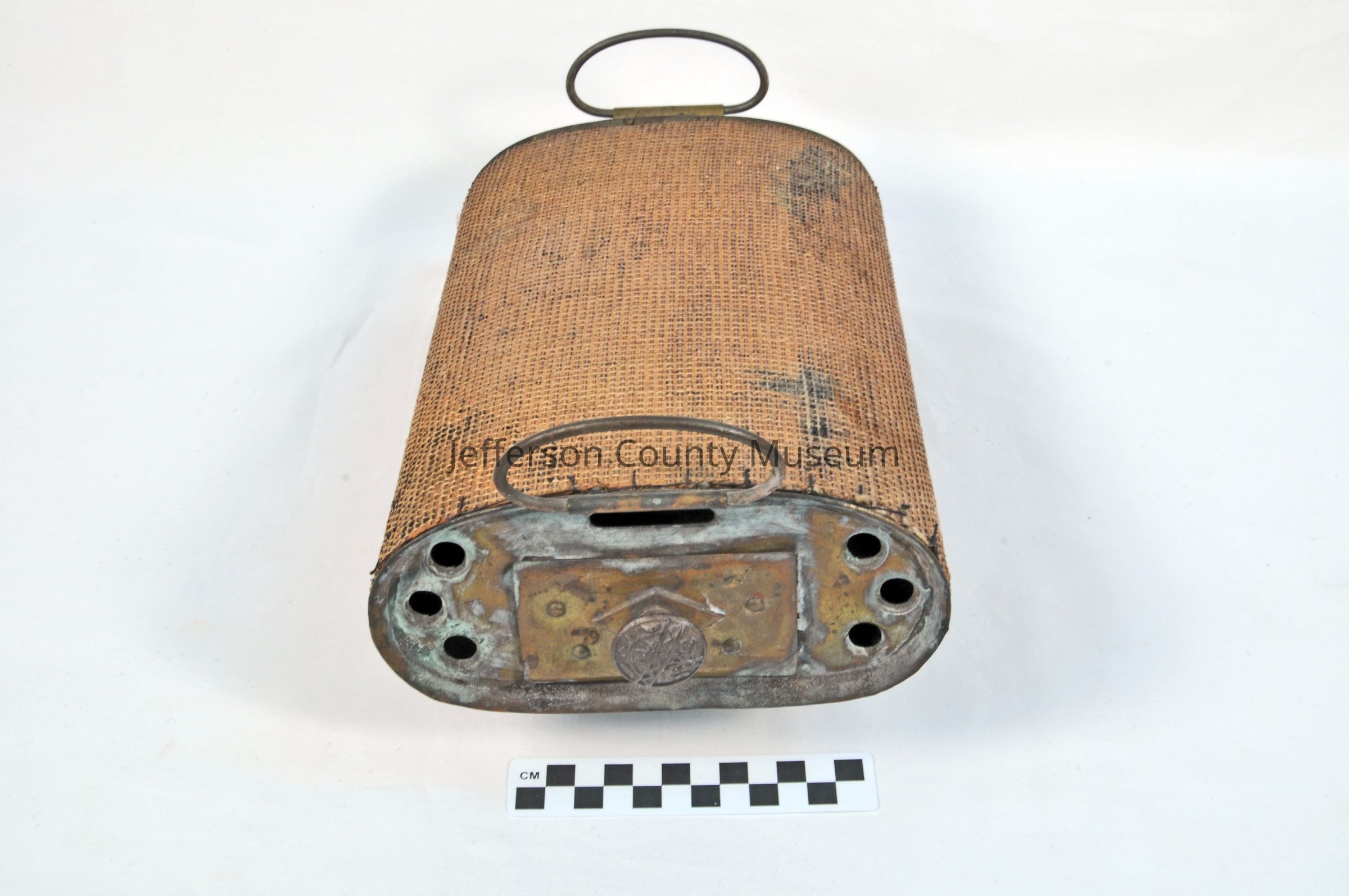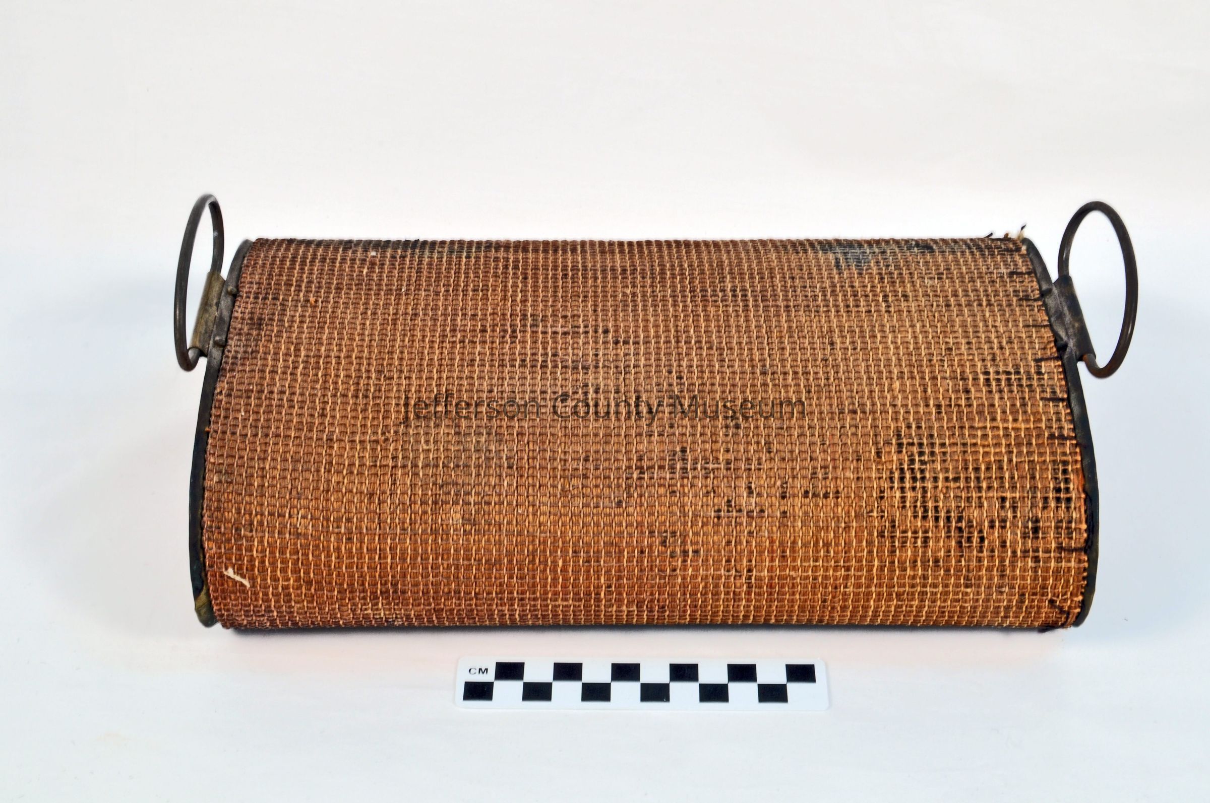 Oval shaped metal footwarmer with a handle on each end, covered with a heavy carpet-like material. Metal pull-out tray for holding charcoal. Two pieces of charcoal are in tray. Holes in each end to let smoke out. Stamped on one end "LEHMAN'S HEATER MANUFACTURED BY LEHMAN BROS. NEW YORK No 6".Acquisition