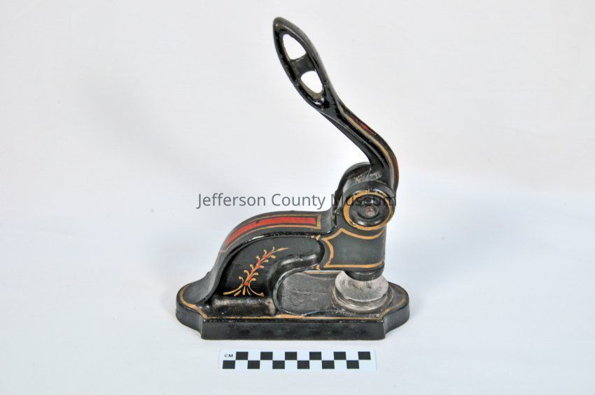Black painted press with gold and red decoration. Handle for pressing seal onto paper. Seal is missing or was not included in donation.Acquisition